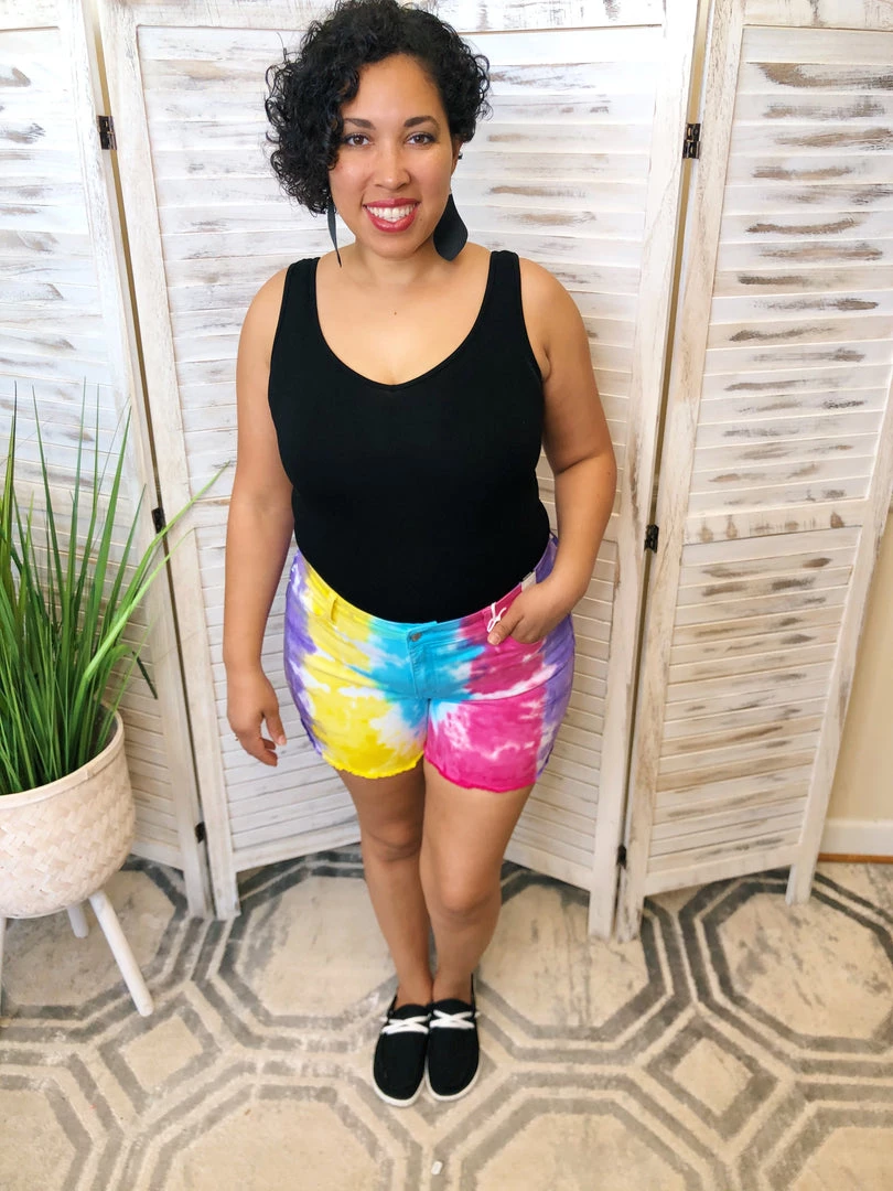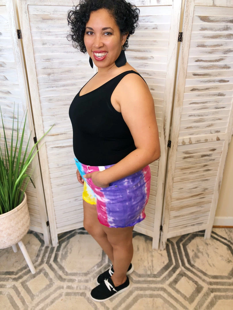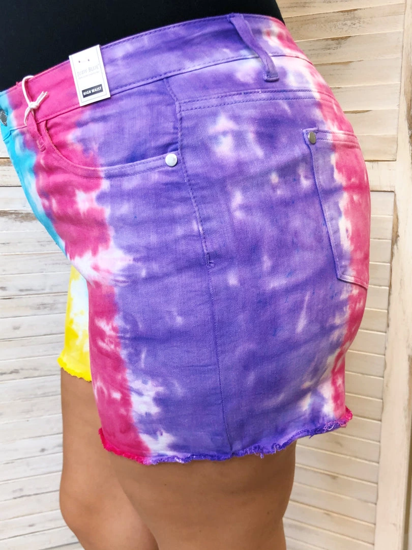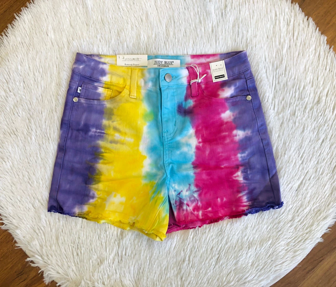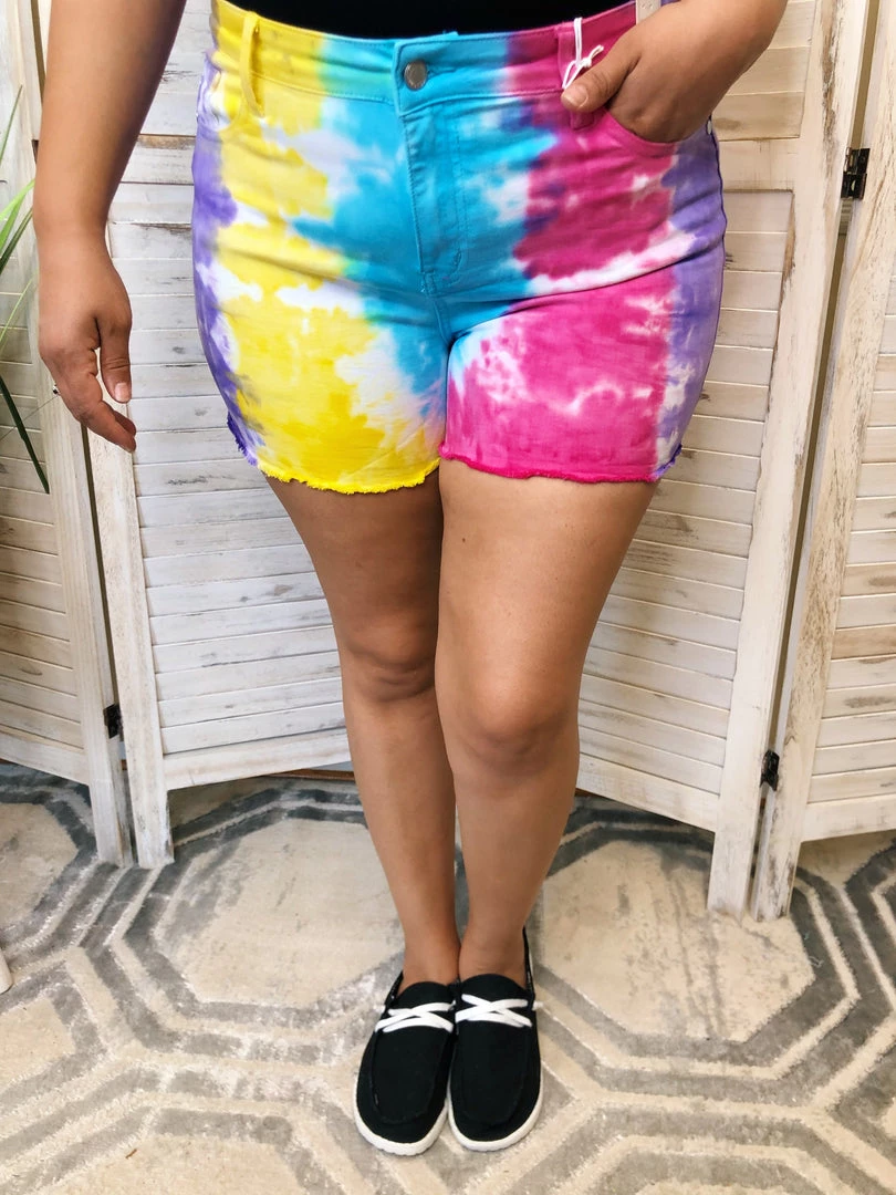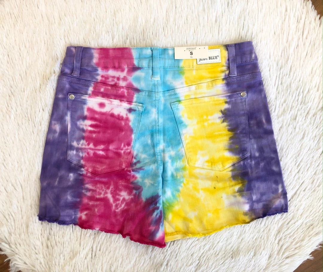 These amazingΒ mid riseΒ shorts feature a bright tie dye waterfall design that is absolutely stunning! Pair this super fun frayed hem shorts with your favorite top for a stand out outfit that will make you the star of the day!