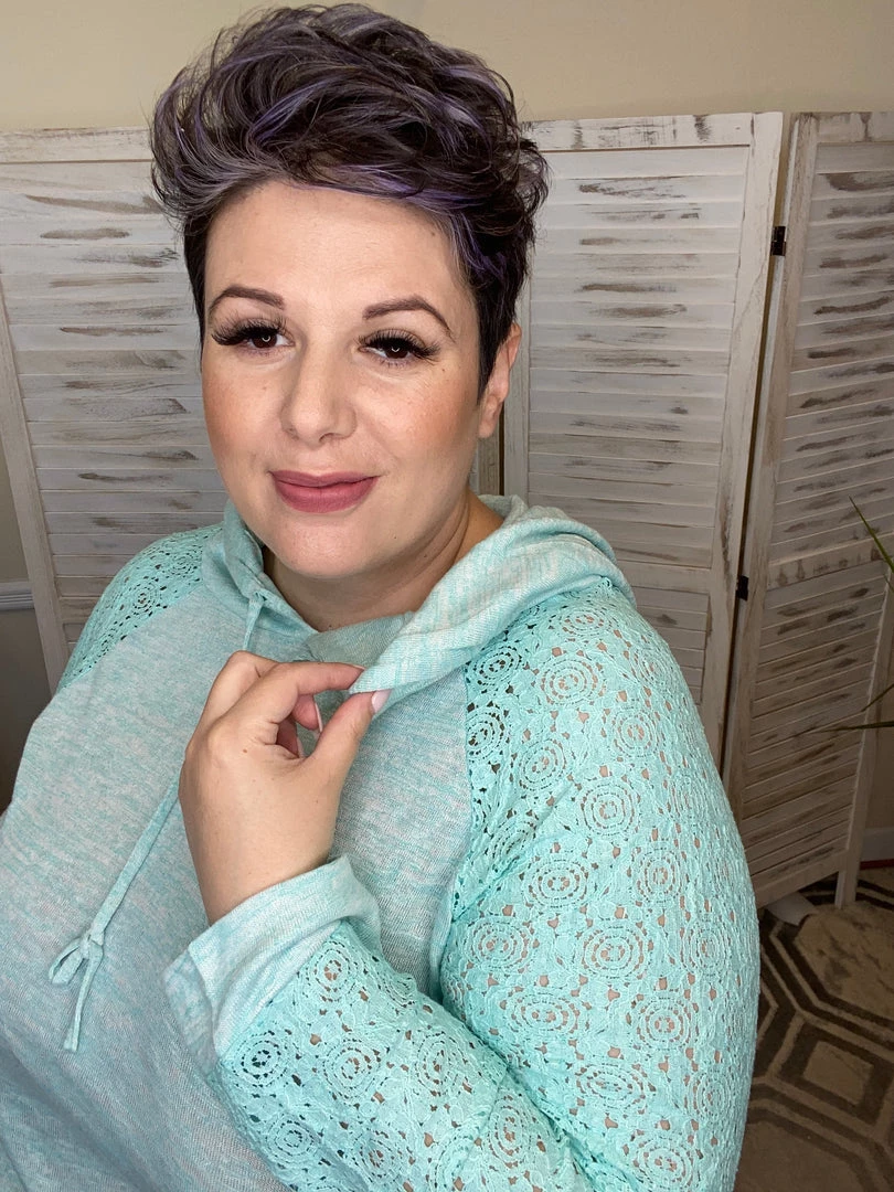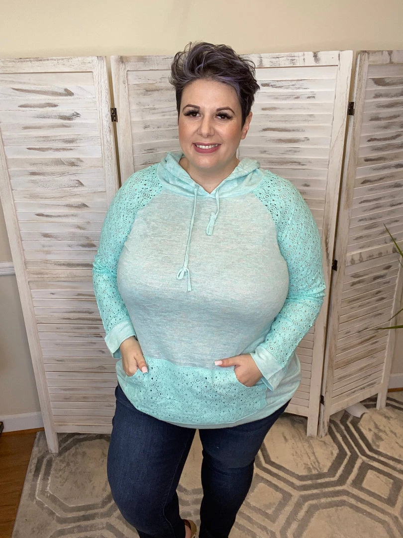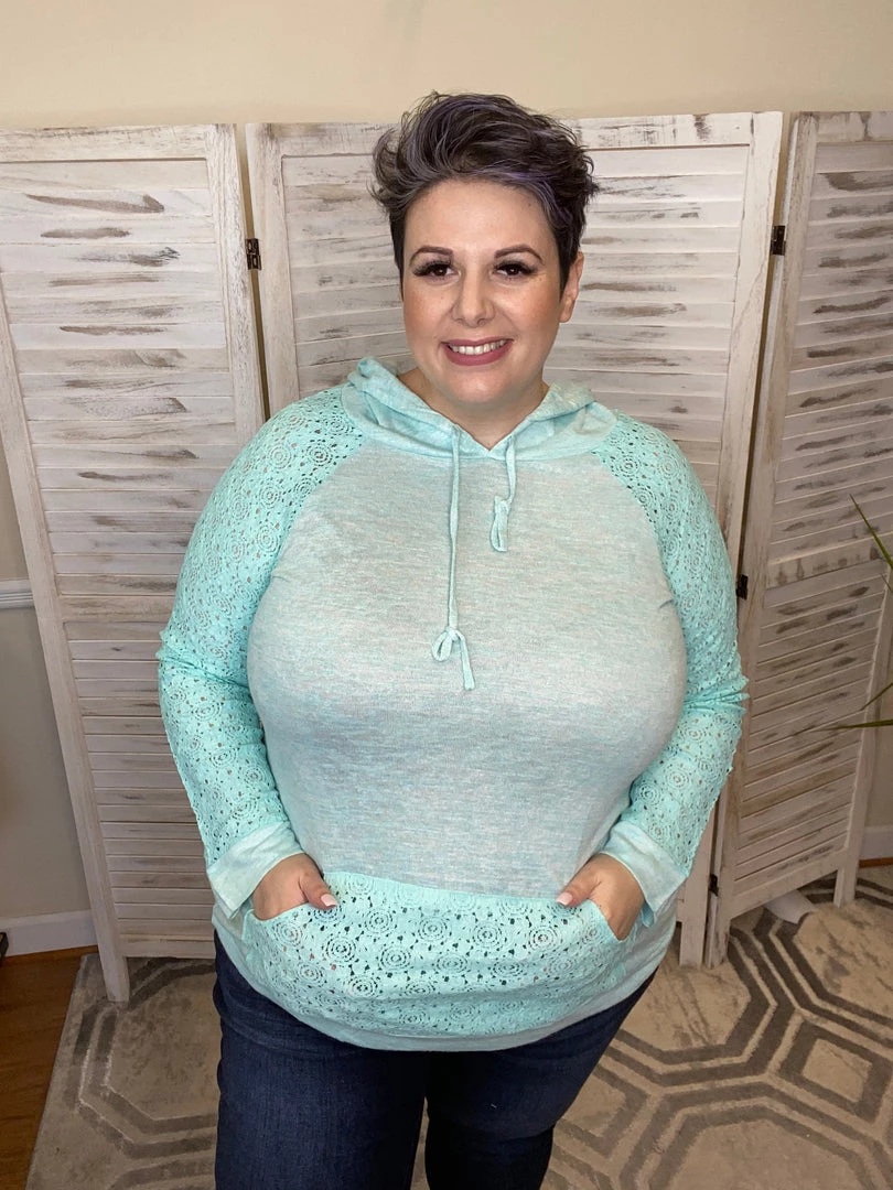 This gorgeous aqua hoodie is lightweight with full lace sleeves. This stunning lightweight hoodie also has a kangaroo pocket made of lace in the front. You do not want to miss this stunning hoodie!Β