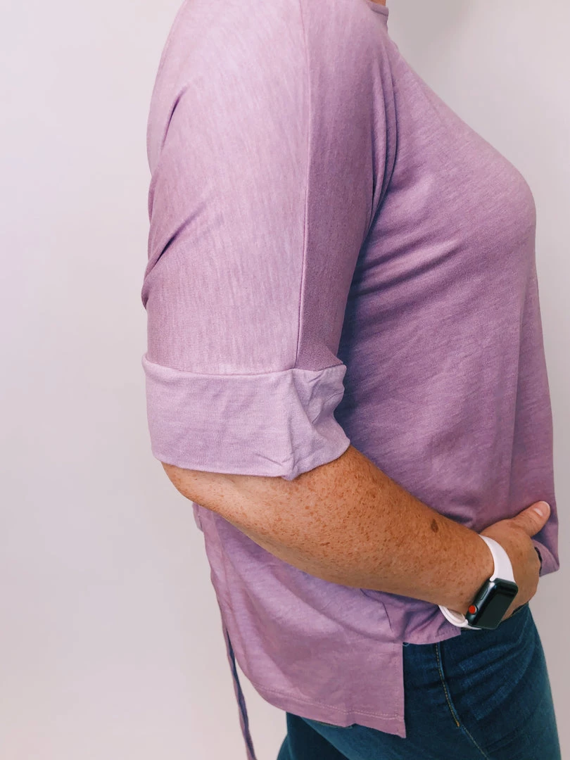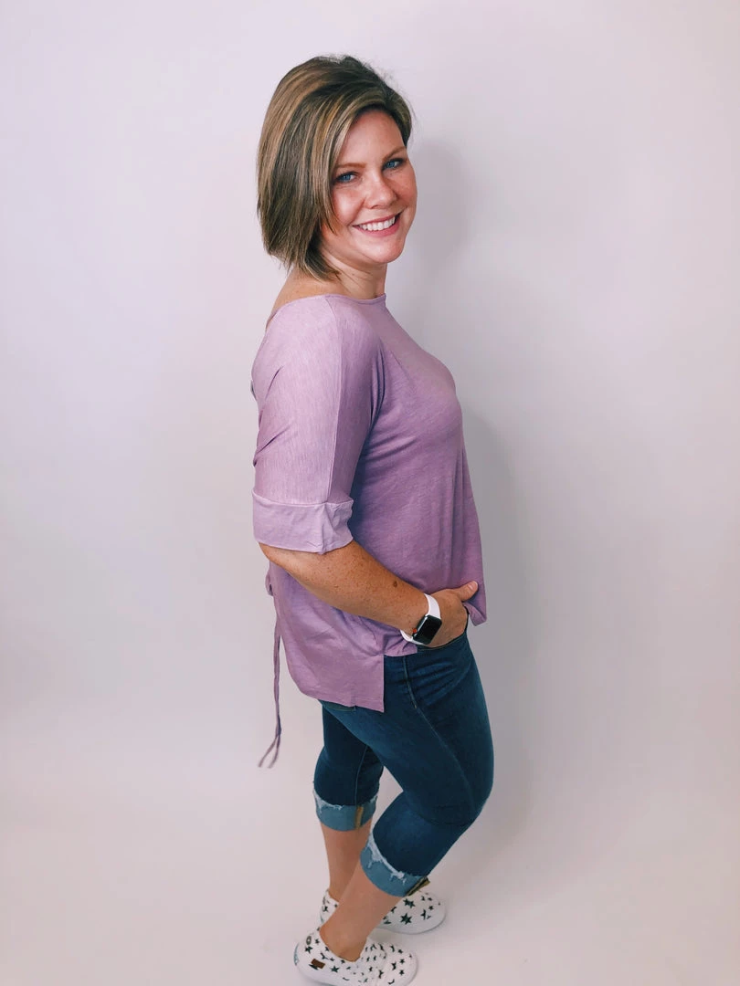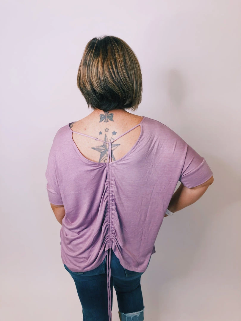 This solid loose-fit knit top feature a ruche v back and a cute string detail. It will be perfect to match with leggings, shorts or your favorite bottoms.Β