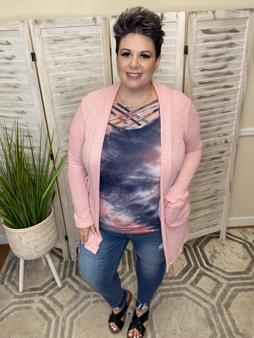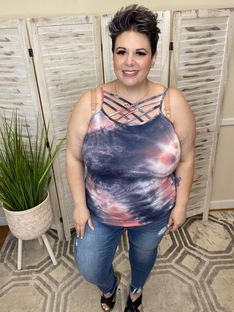 This gorgeous tie dye tank top is absolutely stunning! It features a criss cross pattern on the front and back and has a swirl of colors in different shades of blue and coral.Β