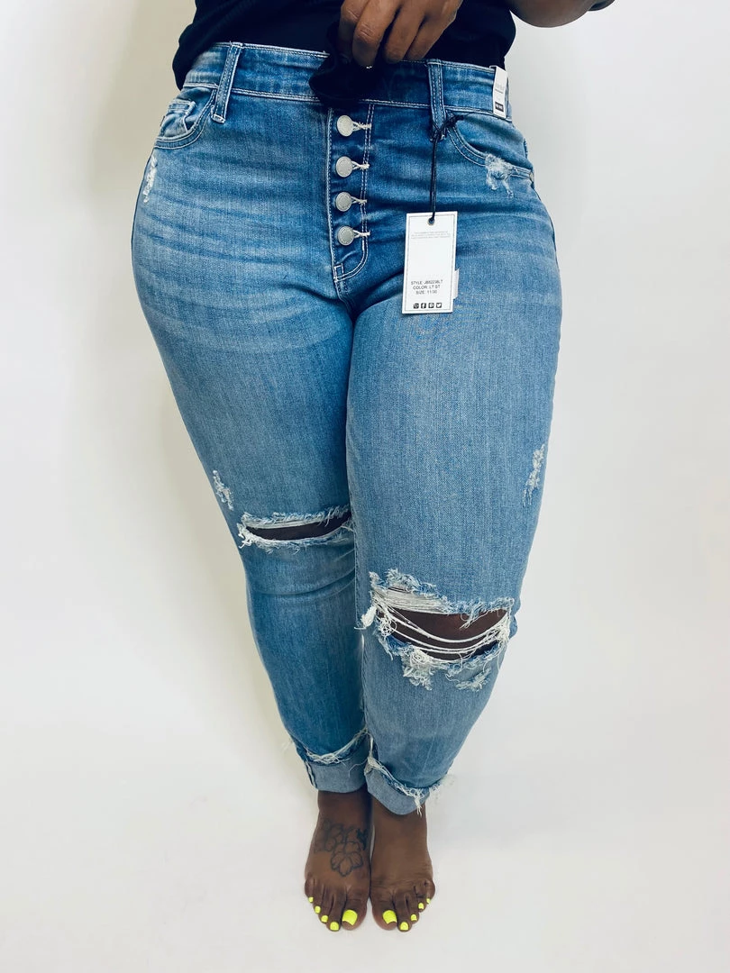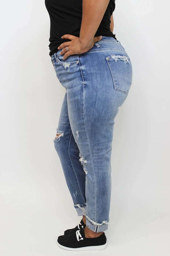 These stunning high waist Judy Blue boyfriend jeans have heavy distressing on the knees and a distressed cuffed hem that can easily be un-cuffed for a longer length. The distressed pockets and light wash make this the perfect pair of jeans to wear when going on life’s adventures!