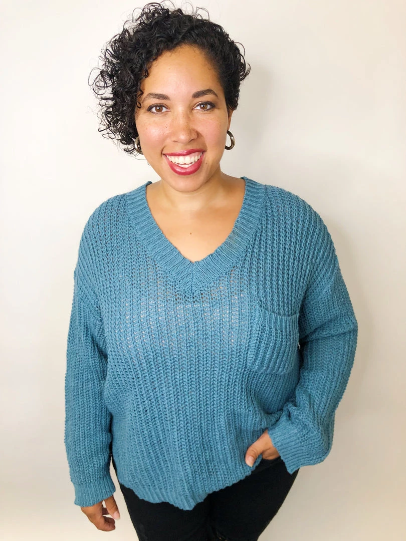 This is the most comfortable knit sweater you will ever wear! The V-neck Β gives this sweater a flattering look and the slouchy pocket gives this knit sweater a cozy casual vibe. It’s really comfy and SO cute. You can pair this sweater with leggings or your favorite bottoms for a cute and casual look or you can easily dress this up for a versatile look.