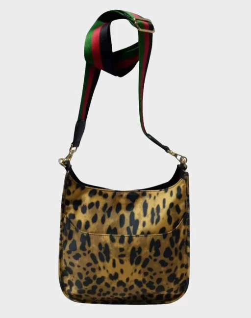 Leopard print bag with stripe strap that you can change for different ones. Really soft material, pockets inside and outside, button closure.Β You will love this beautiful bag!