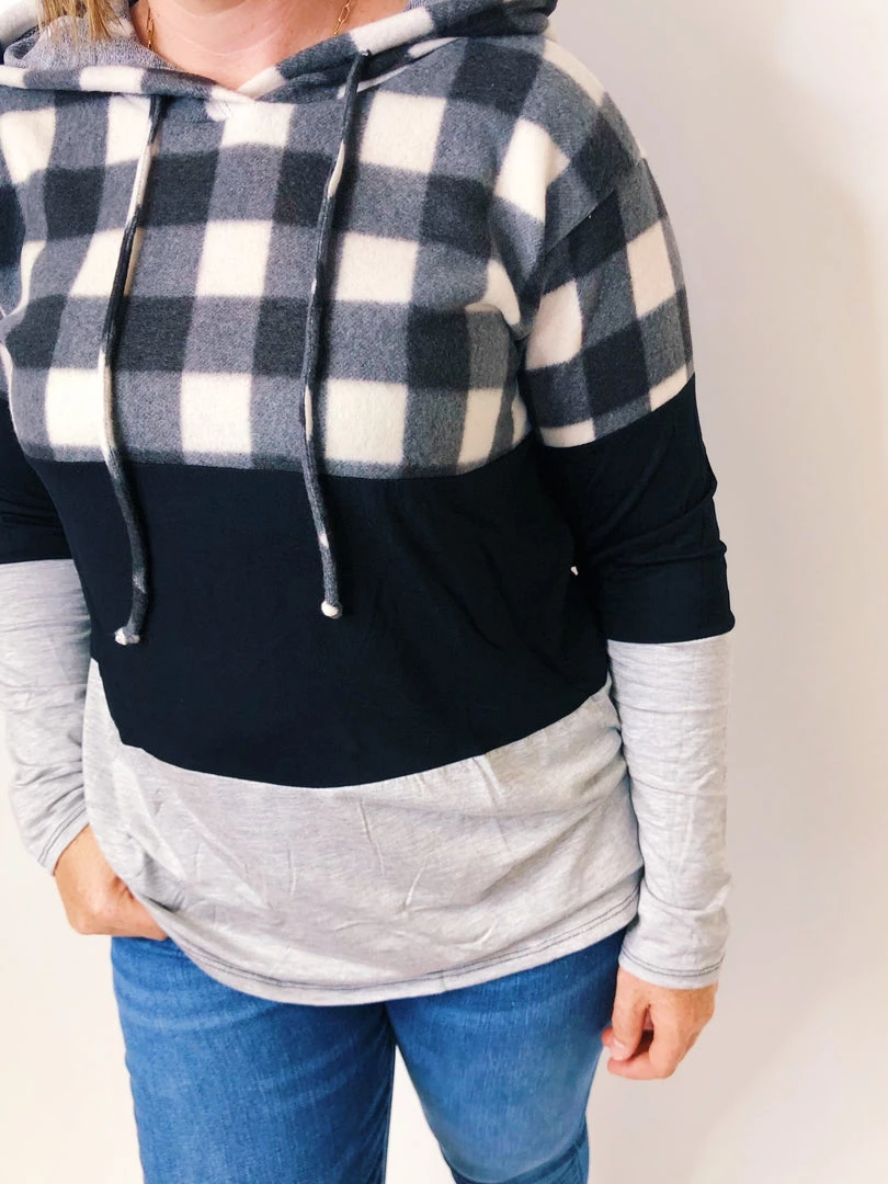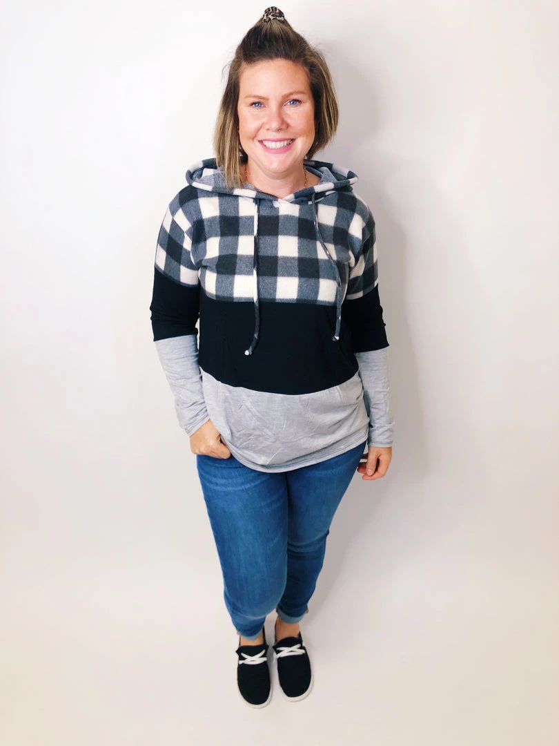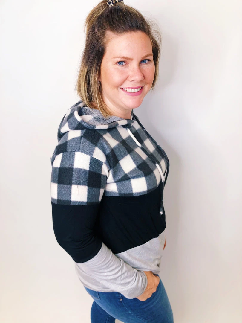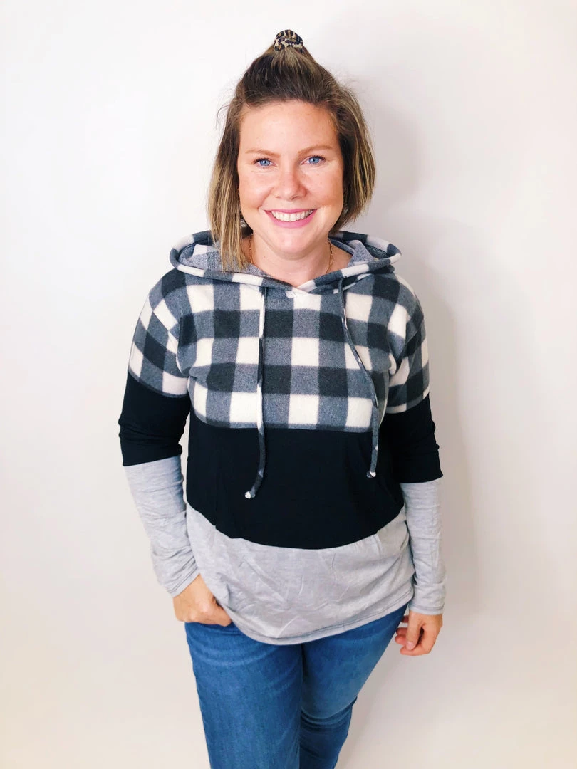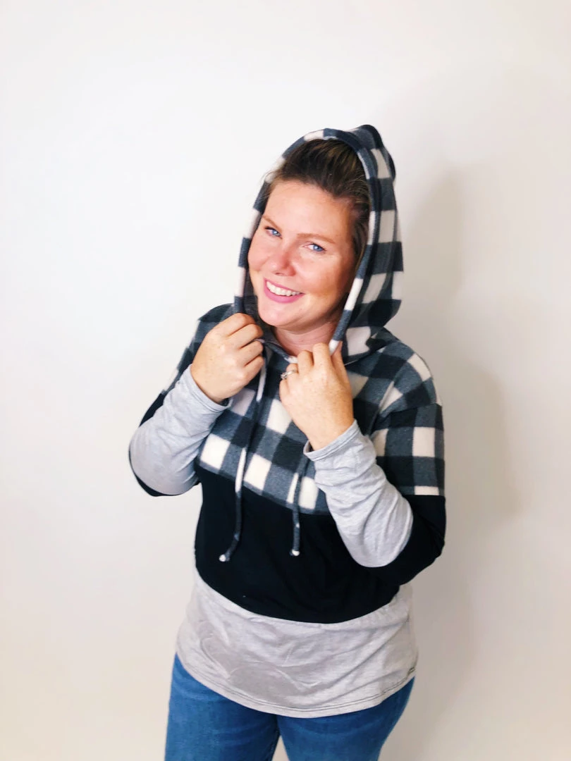 This gorgeous color block hoodie features a really soft buffalo plaid hoodie and shoulder style, a black light weight block, and ends with a heather grey light weight block. This gorgeous Fall inspired hoodie will keep you warm and cozy while also allowing you to breathe and not get too hot!