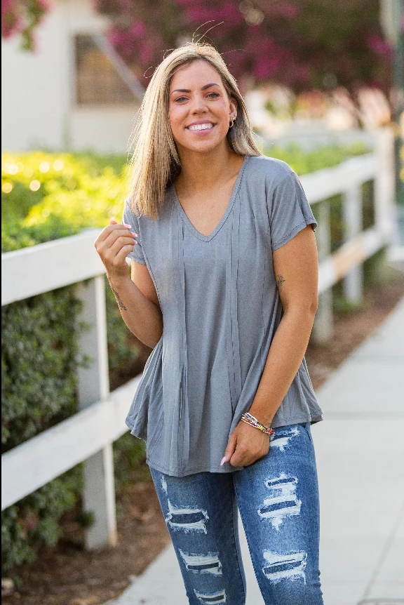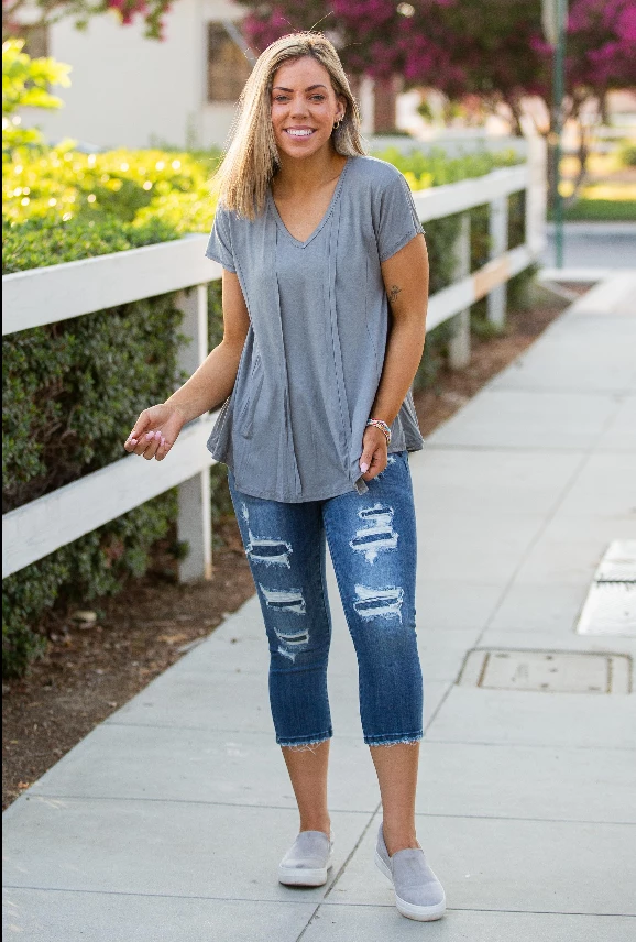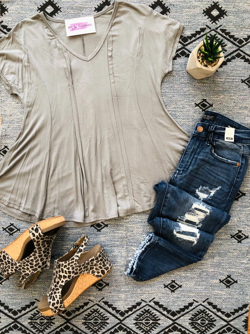 This short sleeve top is making us so giddy! Everything about it is absolute perfection. Made from the softest jersey fabric, this top has the most amazing details, which completely elevates this solid basic to an entirely new level. With an a-line silhouette, this top features a relaxed fit, v-neck, raw edge hem, reverse stitch details and short dolman sleeves.Β Β Β Β Β