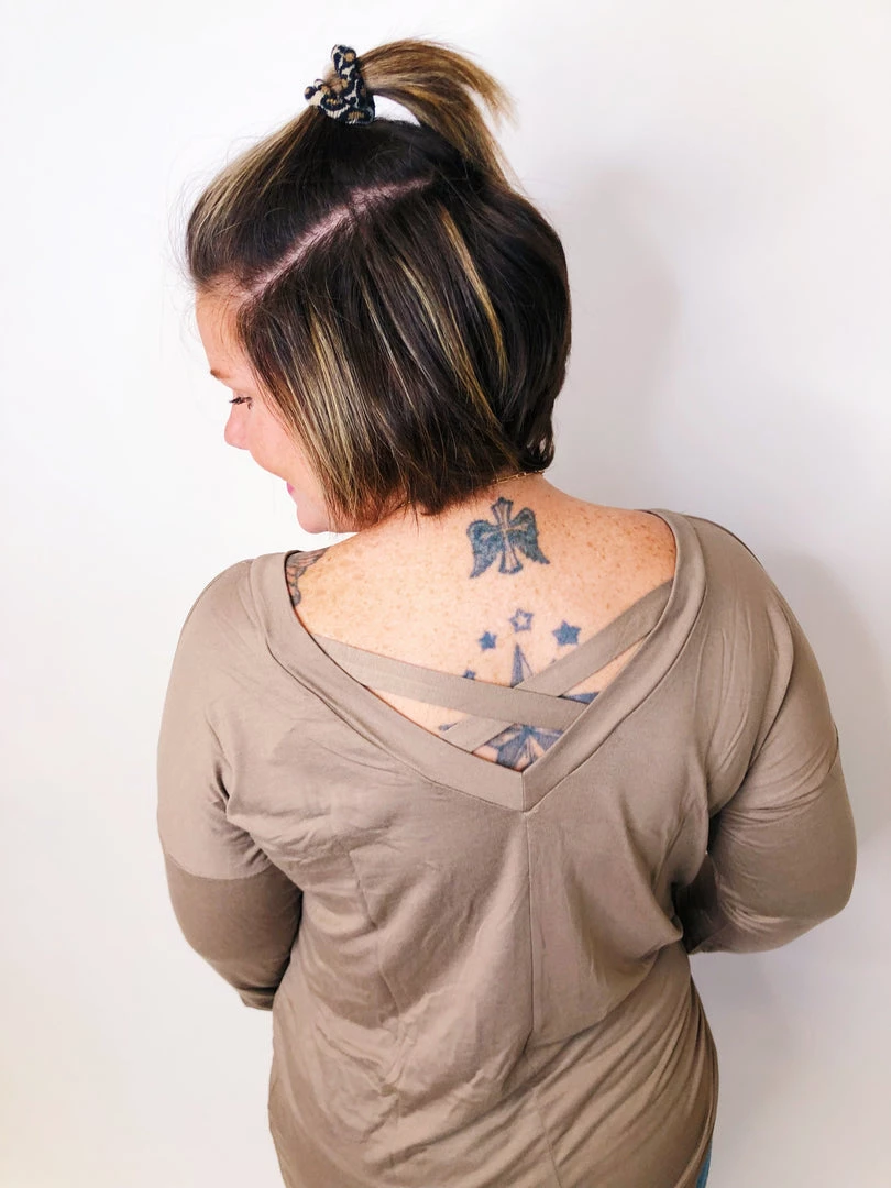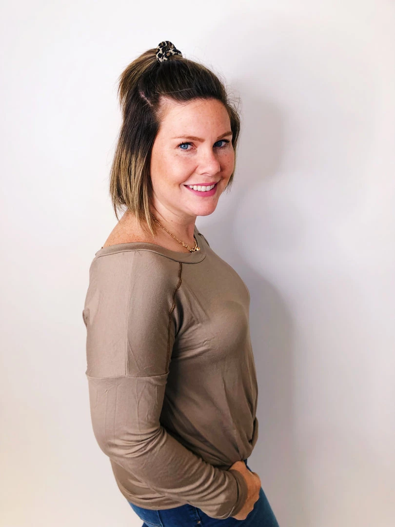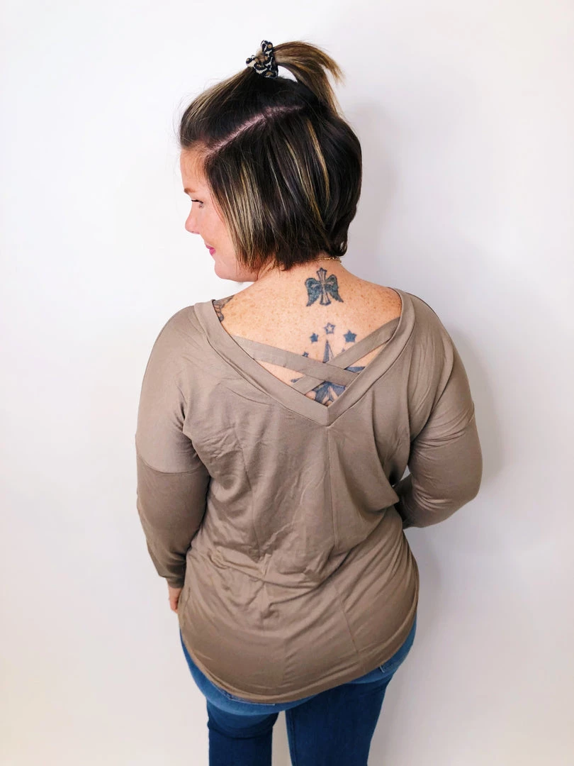 This beautiful mocha top features a criss cross lattice design in the back and a crew neck in the front. This super soft tan long sleeve top has mocha exposed thread on the seams. Flowy and lightweight, this neutral top is a great transitional top to wear all year round!