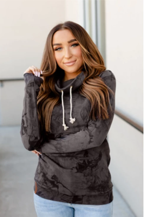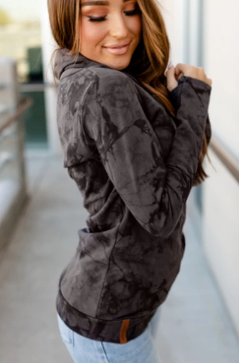 What a beautiful sweatshirt this is! This french terry tie dye sweatshirt by Ampersand features a cowlneck with drawstrings so you can easily tighten it up to your desired width. It has great stretch but runs more fitted so we recommend staying true to size. This gorgeous sweatshirt has thumbholes so you can keep your hands nice and toasty!Β