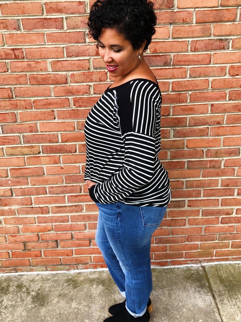 This is a long sleeve top that is so cute and soft. It features a criss cross detail on the back and the color black with ivory lines makes this top really versatile and to give a fun and flow look it has a high low style. You can easily pair this top with leggings or your favorite jeans, with shoes for a casual look or with boots/heels for a chic look.