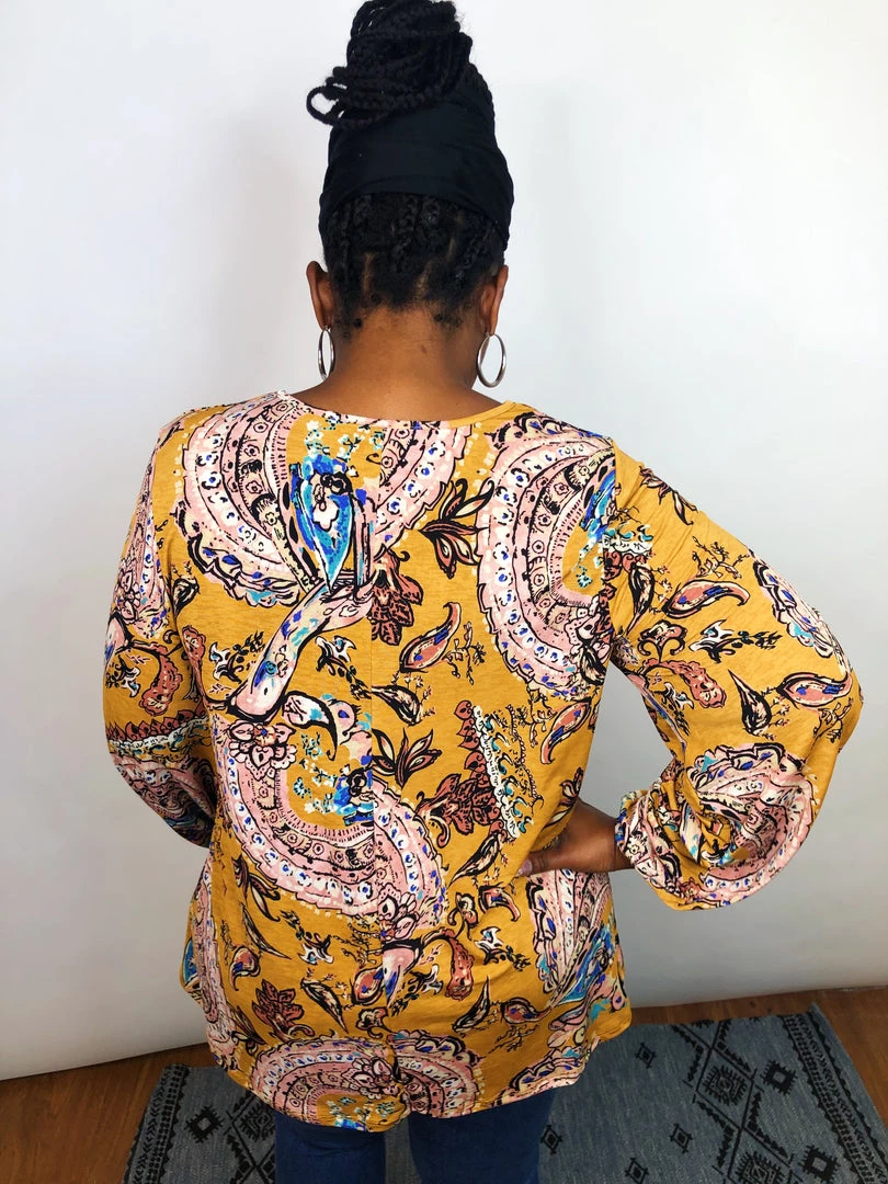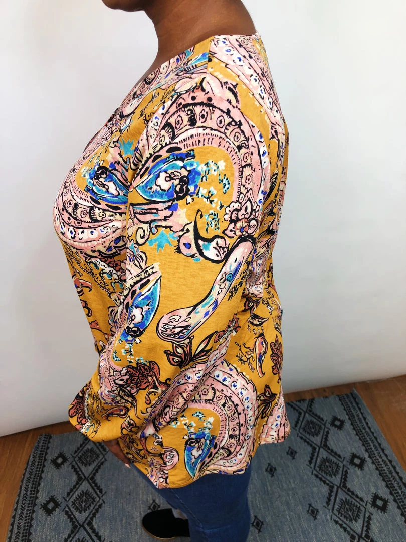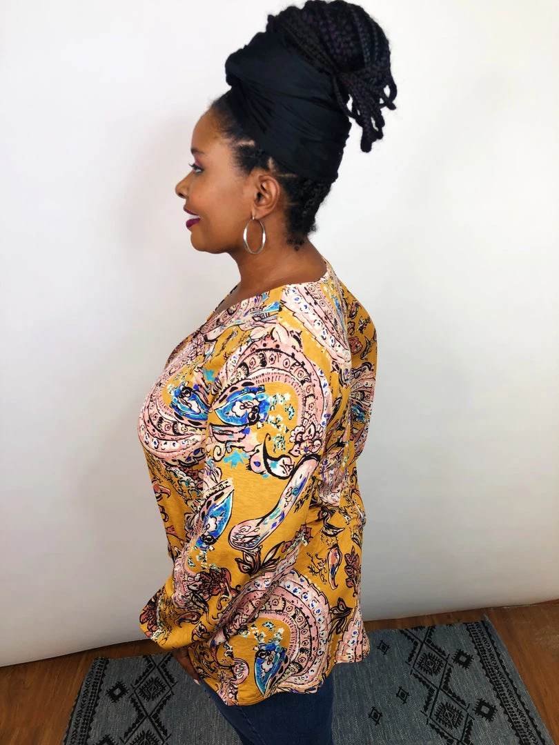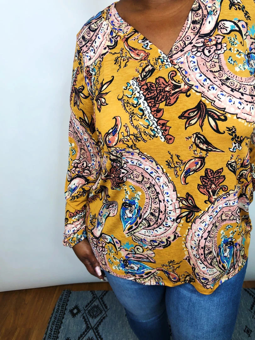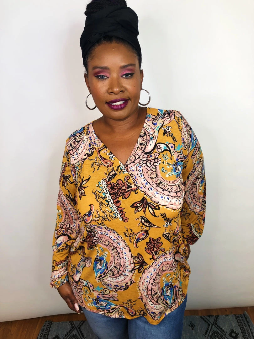 This beautiful long sleeve, v-neck top a perfect transition piece for Fall. This lightweight top has amazing stretch and features a mustard background with pink and mauve paisley designs on it! This stunning lightweight top is so flattering and designed to accent your gorgeous curves in all the right places!