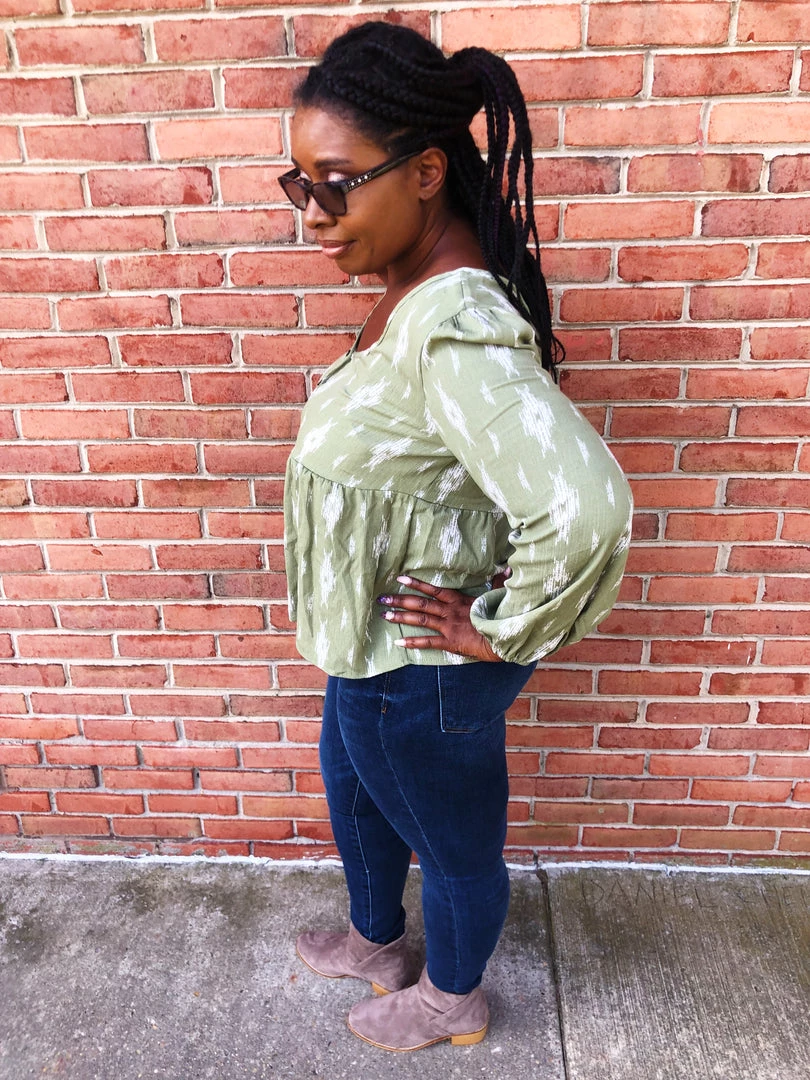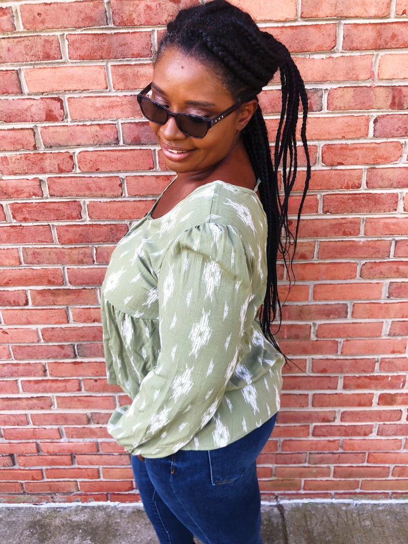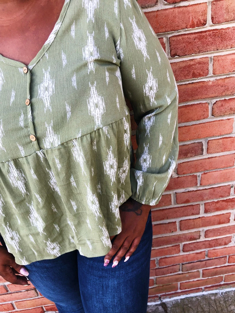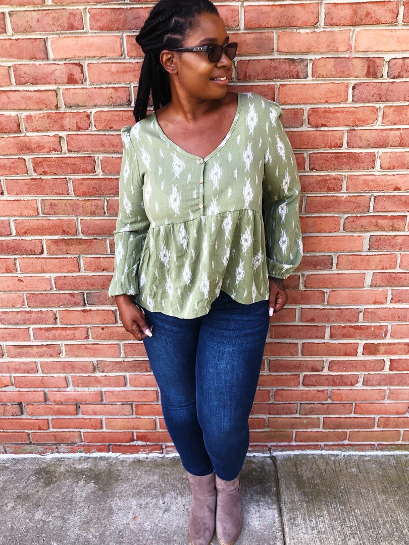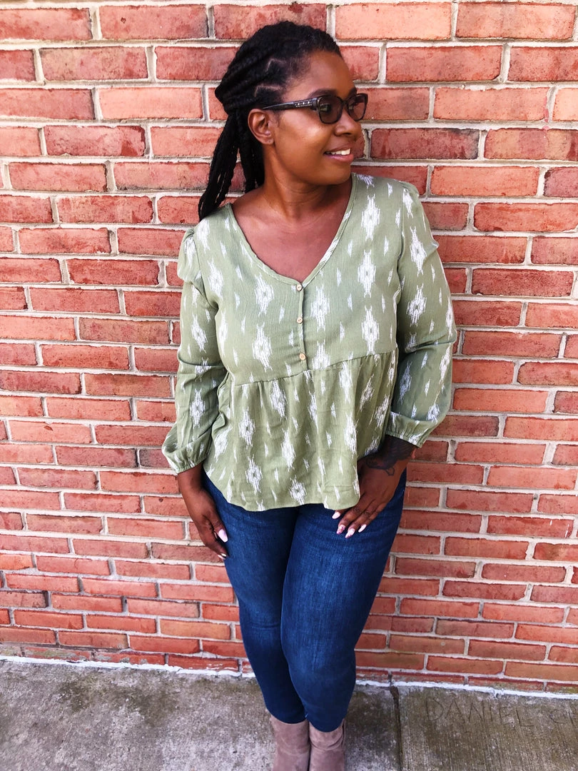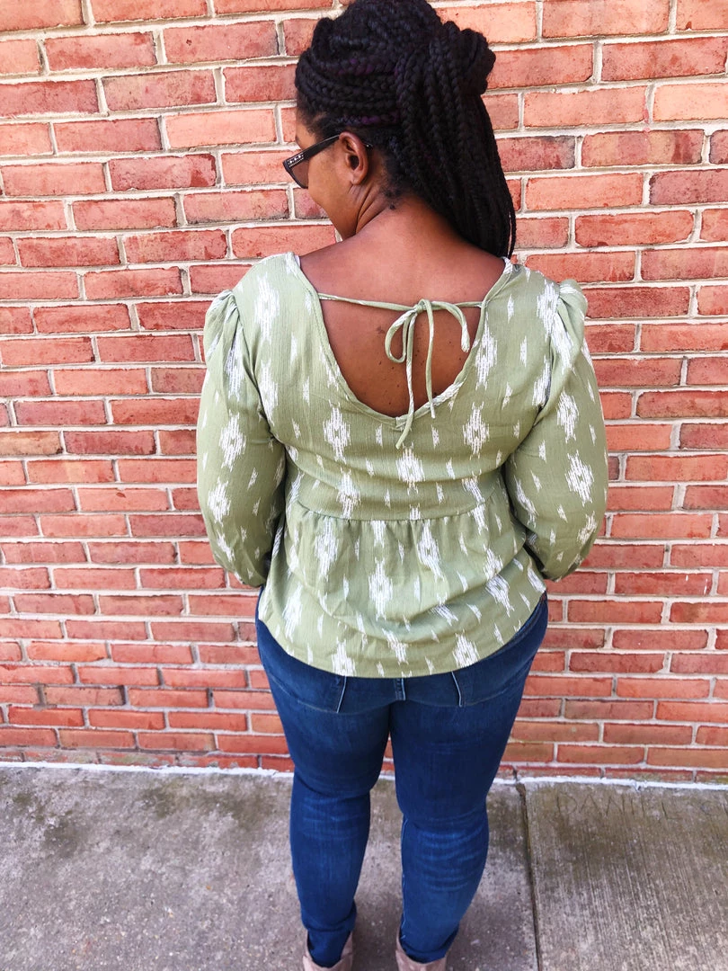 This beautifulΒ top isΒ green withΒ ivory colored diamonds on it. This top features faux buttons down the v-neck front, a tie in the back and long sleeves. The cut of this shirt has such a whimsical vibe! Snag this lightweight top before it’s too late.Β