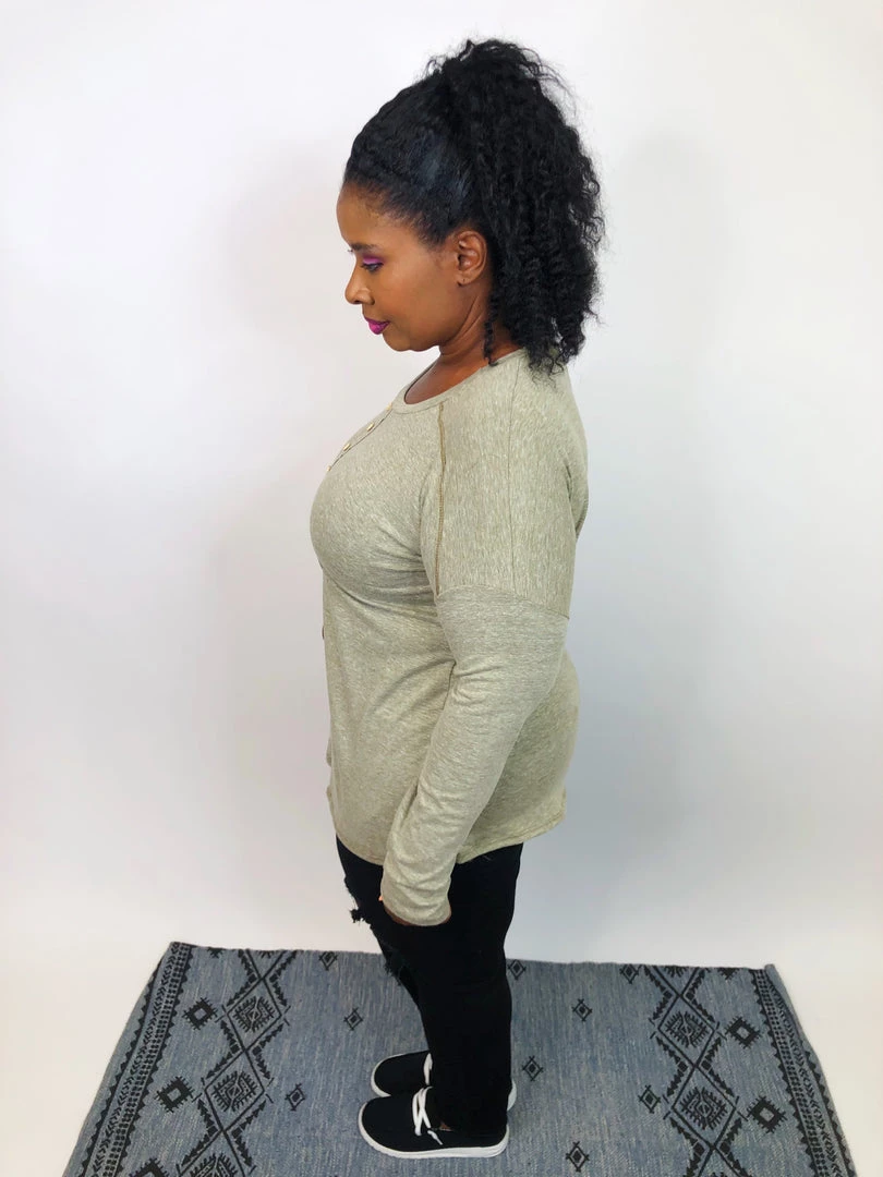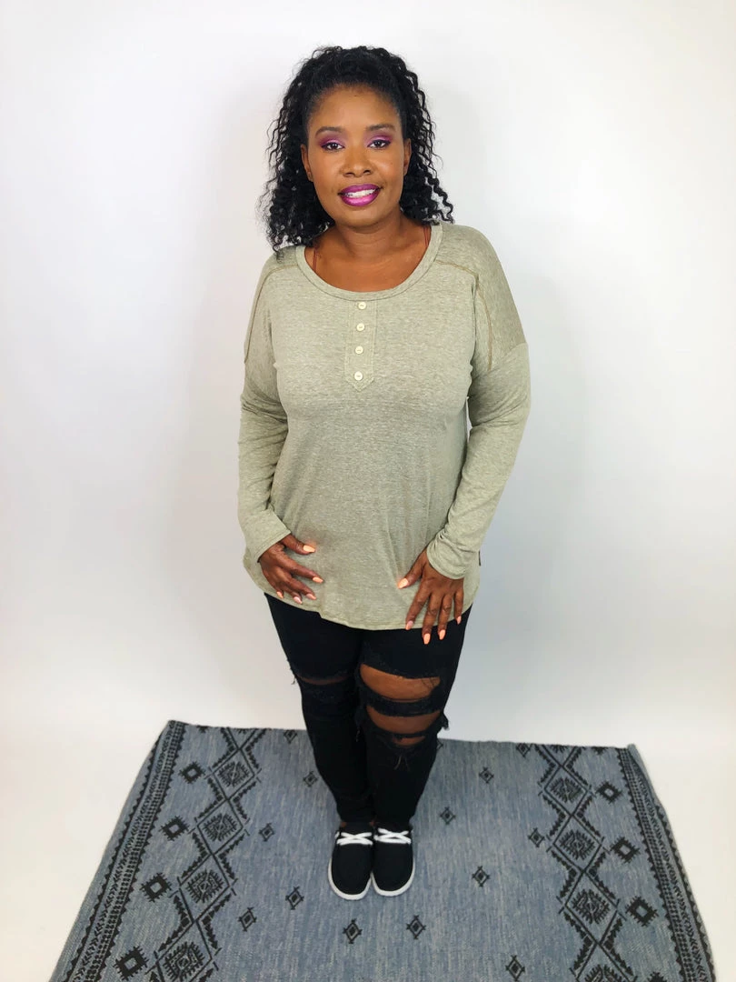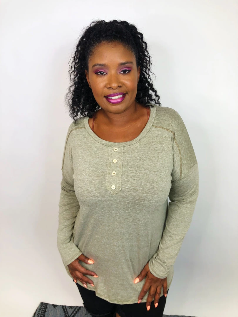 This cute and super soft long sleeve top, it is just the perfect piece for the chill weather. It features cute wood bottoms along with the scoop neck, and the olive color it is ALL about fall and winter!! You need this top in your closet, believe us! You can pair with legging or joggers for a comfy “stay home” look, or with your favorite jeans and boots for a super pretty “going out” look, and still be comfortable.