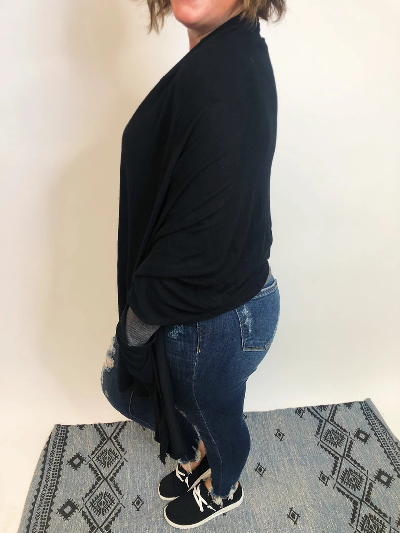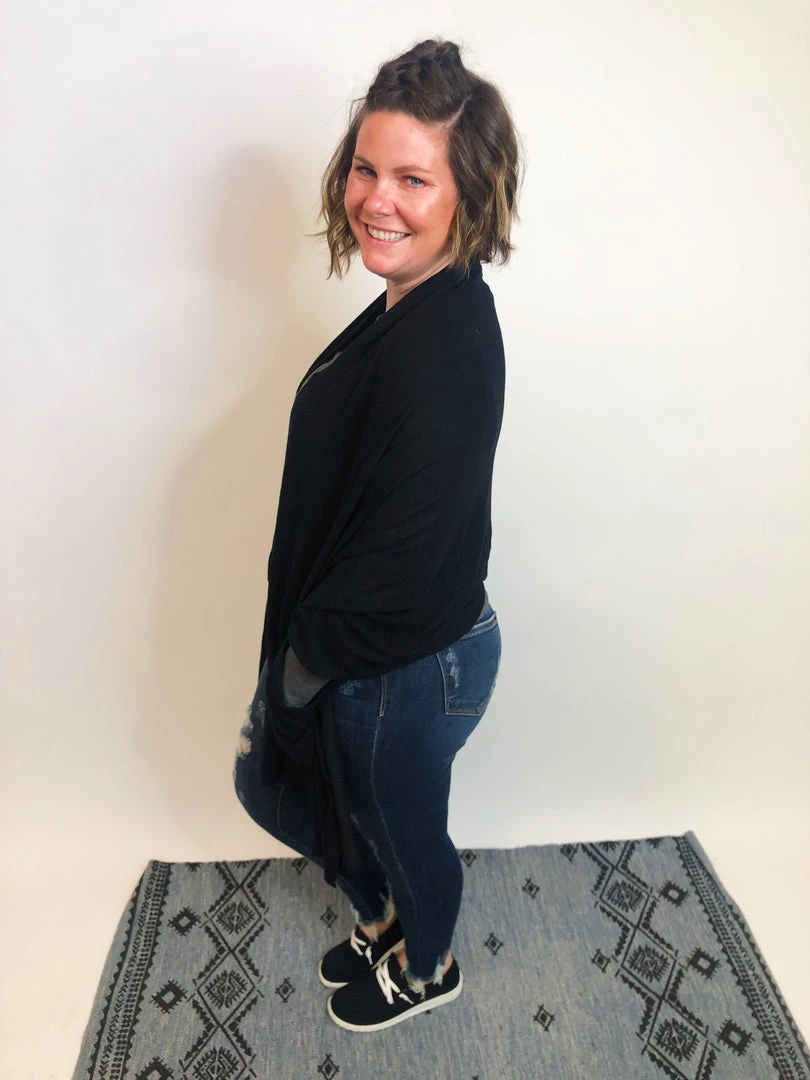 This is the most beautiful and super soft scarf ever!!! It came with pockets so you will look super cute and comfortable the whole time!Β The black color it’s just a plus for being such a versatile option! It’s super cozyΒ and it can be worn as the perfect layering piece, over a dress or a cute turtleneck top, with your favorite jeans for a extra warmth over the fall and winter months! Believe us, you will need this scarf in your closet!!