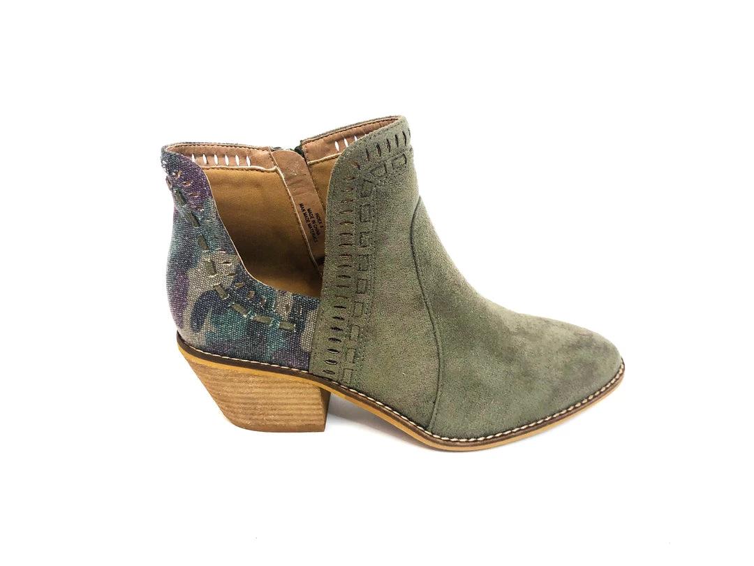 These adorable boots feature a deep U cut out on the outer side of the boots and a zipper on the inner side. The boots are rimmed with a super cute laser cut stitched look that add a unique flair. The inside of the shoe has amazing cushion to keep your feet happy all day. The olive green suede of the upper/front part of the boots compliments the camo fabric and brings out the print and details on these gorgeous shoes. These boots have a 2” heel.