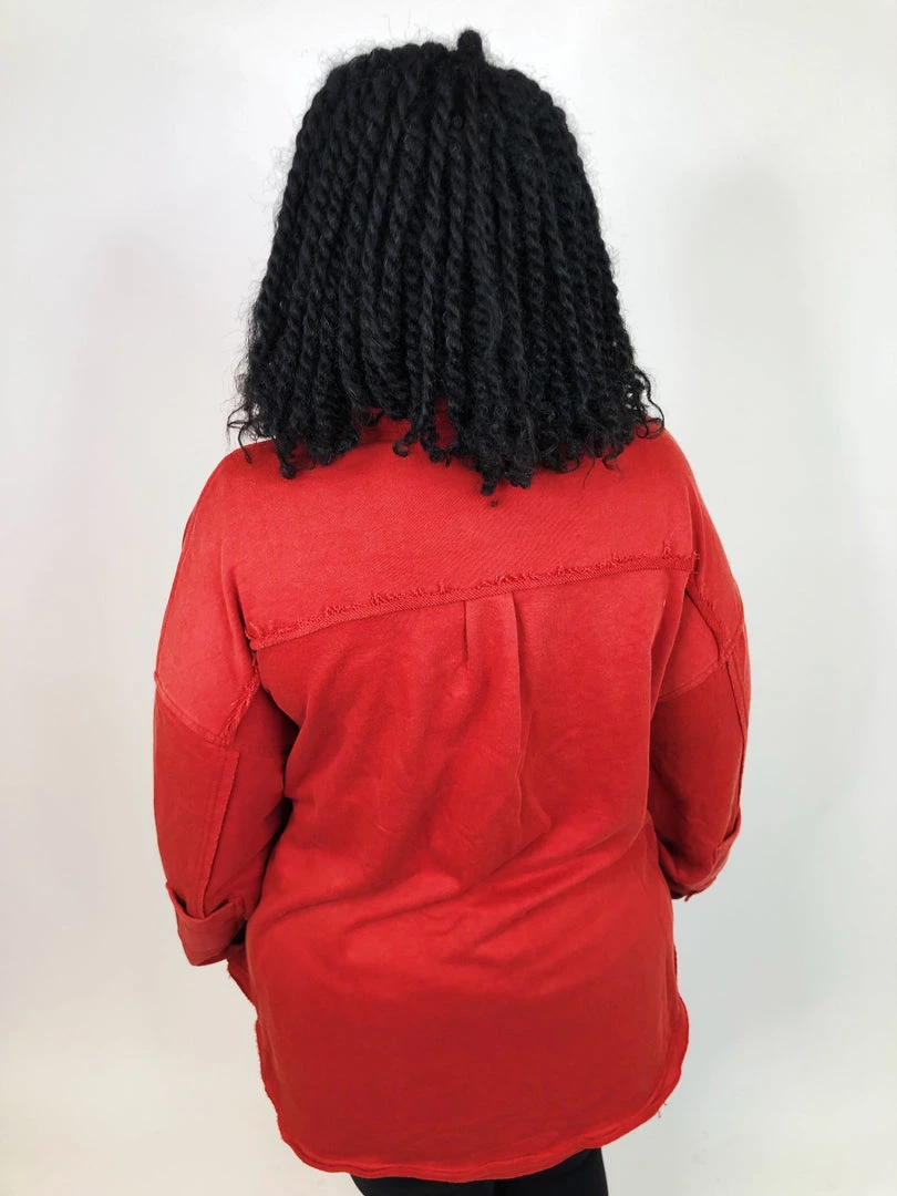 This gorgeous red jacket is so soft and comfy! It features side pockets and raw hem details with cute bottoms. The beautiful red color is just stunning and perfect for fall outfits! The french terry fabric is soft and lightweight but will still keep you warm.Β