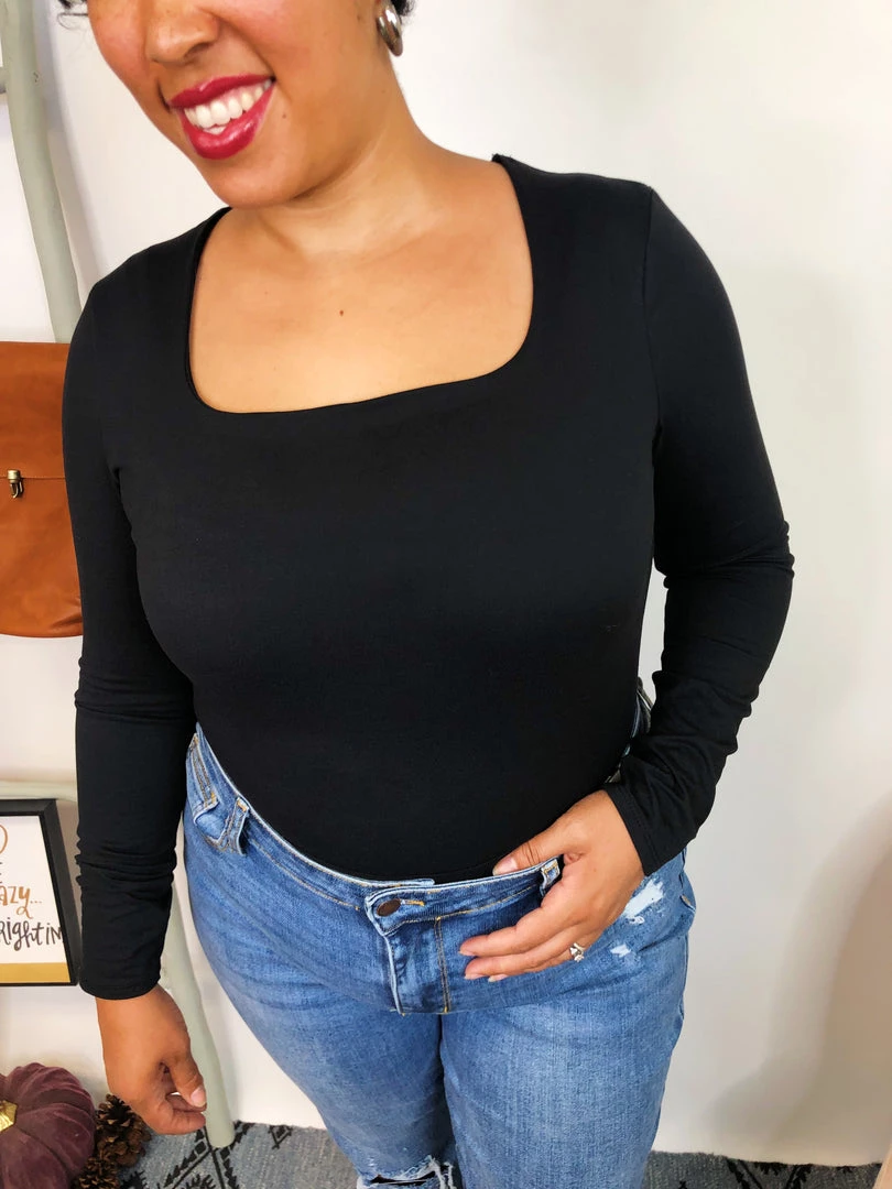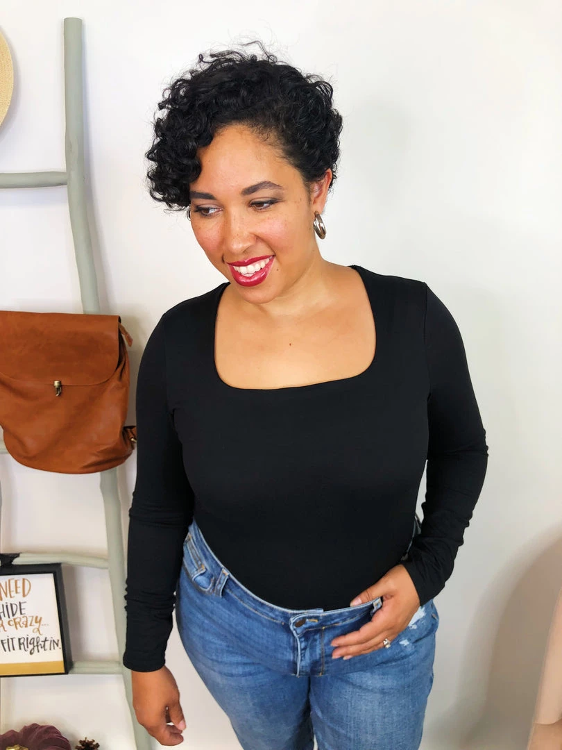 This bodysuit is everything! Made by White Birch, this bodysuit is buttery soft with long sleeves and a square neckline. The snaps at the bottom allow you to easily function throughout the day. This bodysuit has amazing stretch!