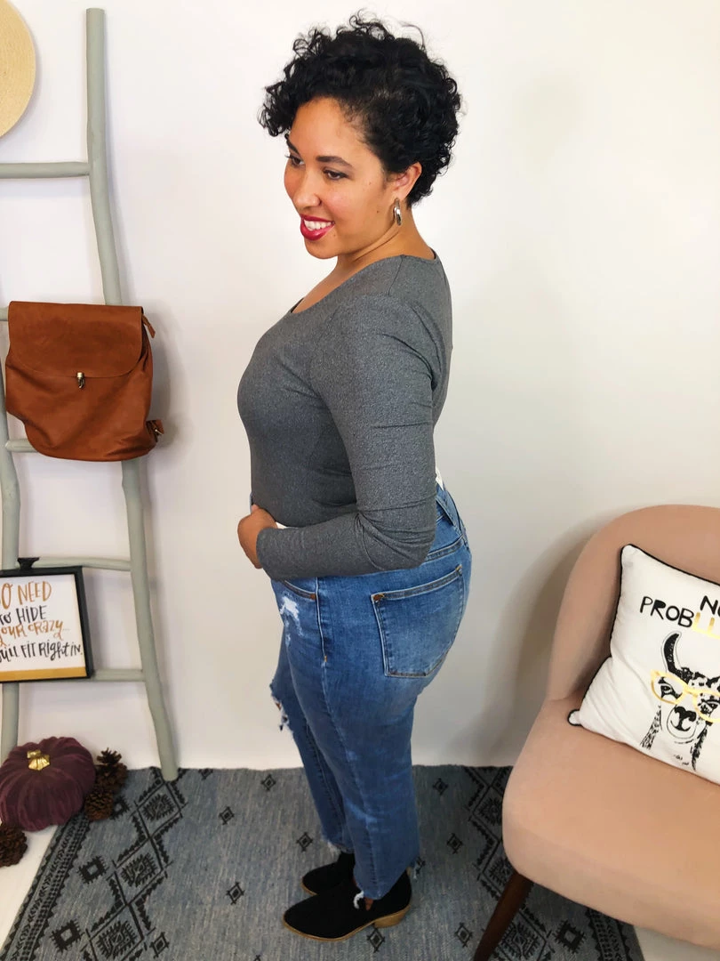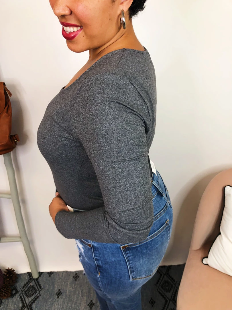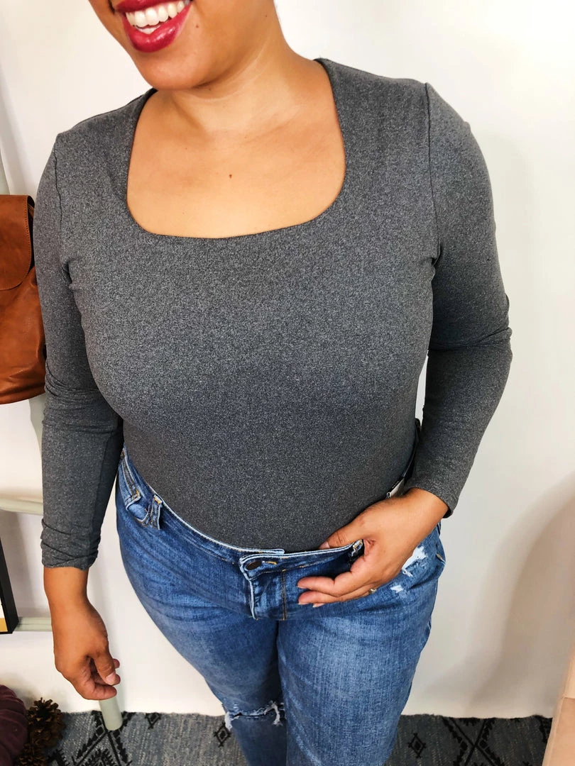 This bodysuit is everything! Made by White Birch, this bodysuit is buttery soft with long sleeves and a square neckline. The snaps at the bottom allow you to easily function throughout the day. This bodysuit has amazing stretch!