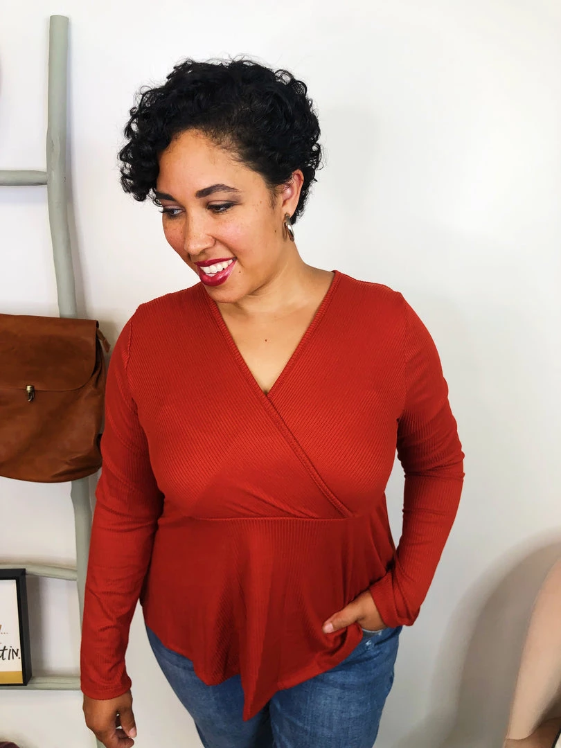 This absolutely adorable babydoll top features a v-wrap front that slightly flairs to accent your gorgeous waist! This long sleeve top oozes comfy sophistication with its ribbed fabric and soft texture. The stretch on this top is AMAZING and this cognac color is perfect for Fall! Snag this and pair with your favorites booties for an adorable look that can be dressed up or dressed down.