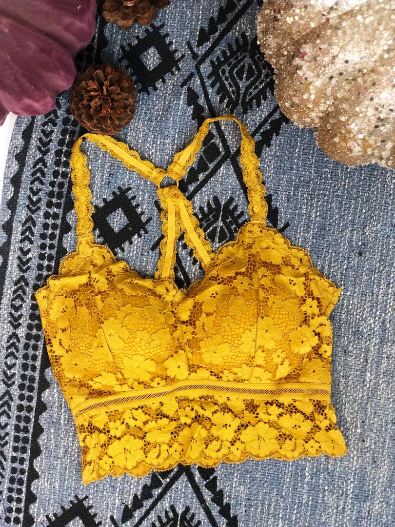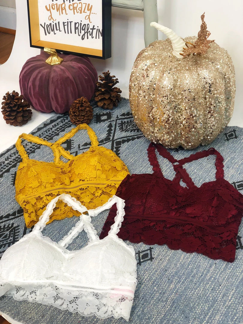 Gorgeous bralettes that have a stunning criss cross back and lace trim at the bottom. This bralette has a racerback strap design. The lace throughout the bralette has a floral design on it and is so soft. The thicker push up pads are easily removable. Perfect for adding a pop of color to any outfit- whether it be an off-shoulder, open back top or full shoulder top. This bralette has amazing support!
