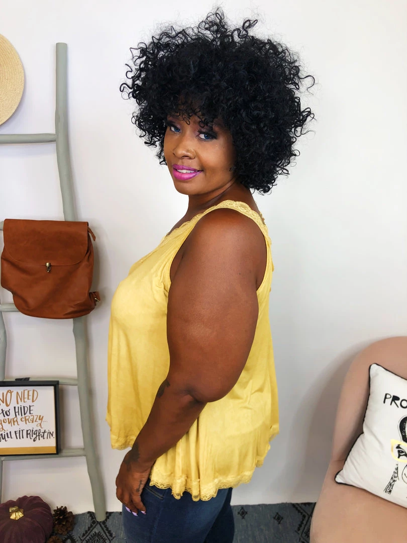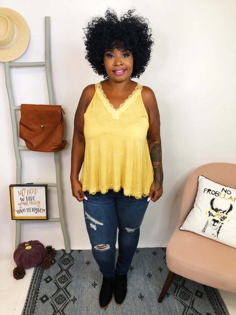 This beautiful sleeveless top it’s really soft and comfy. It features a cute lace trim at the bottom and all the way around the shoulder, neck and the strap on the back. The yellow color it’s a plus for cute fall outfits. It’s a high low top and which gives a nice flow to it. The light material makes the perfect every day top and you can easily pair with leggings, shorts or your favorite jeans.