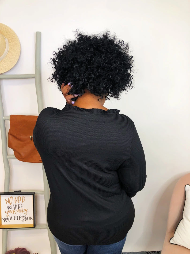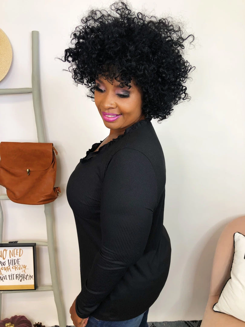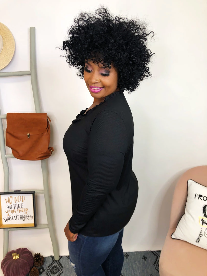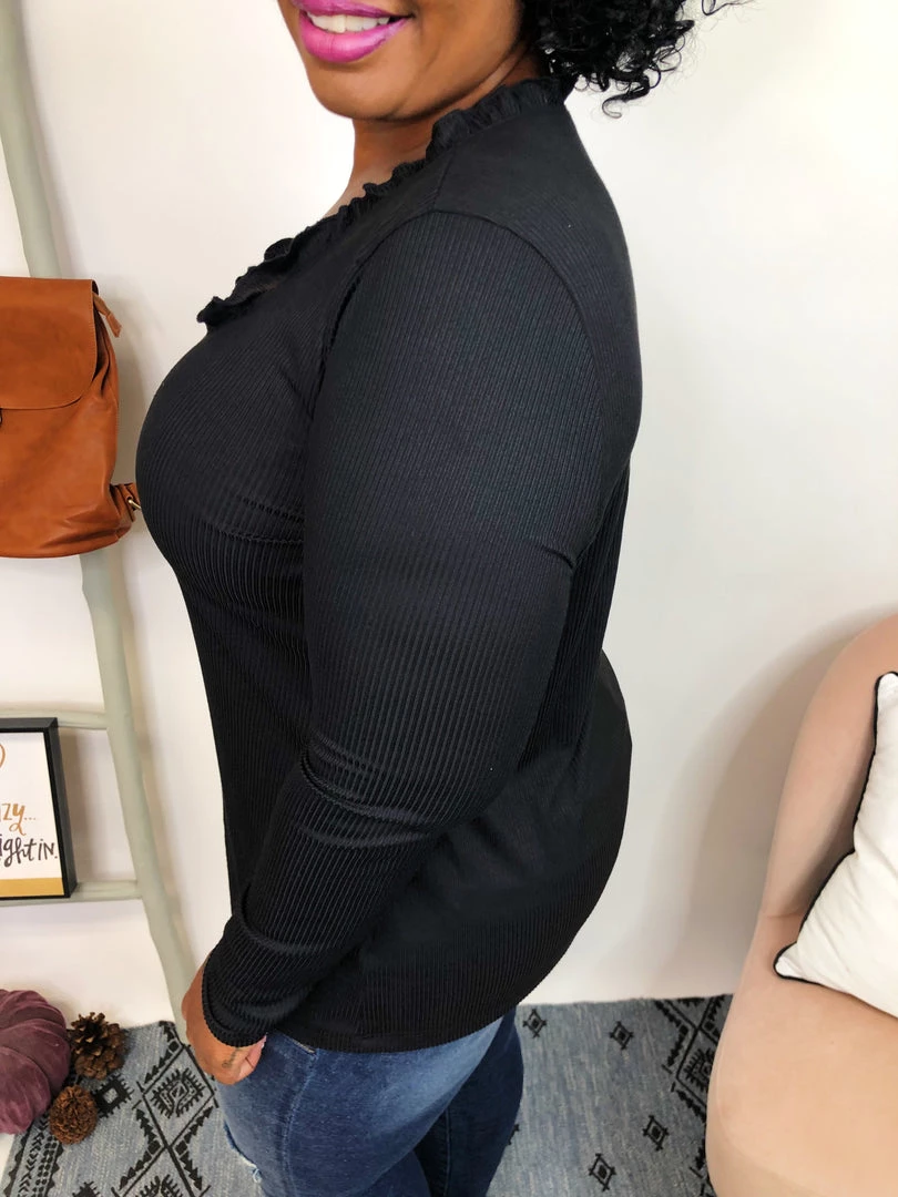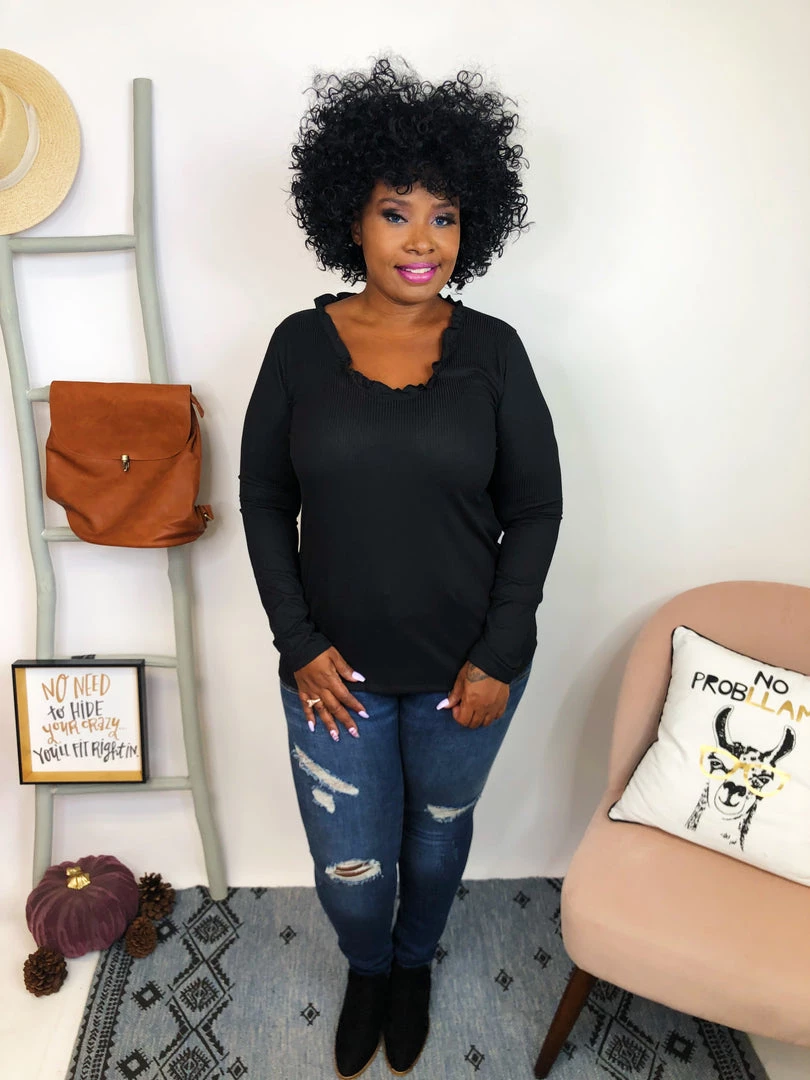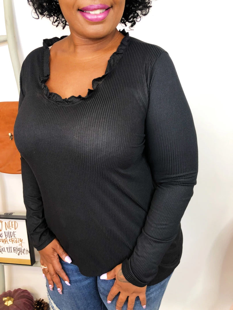 This incredibly soft top has ribbed fabric and a gorgeous ruffled v-neck line. It has amazing stretch and and an elegant silhouette that is so flattering! This fitted topΒ absolutely perfect for all occasions!