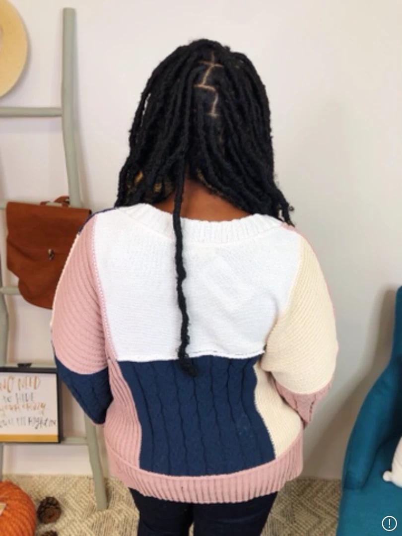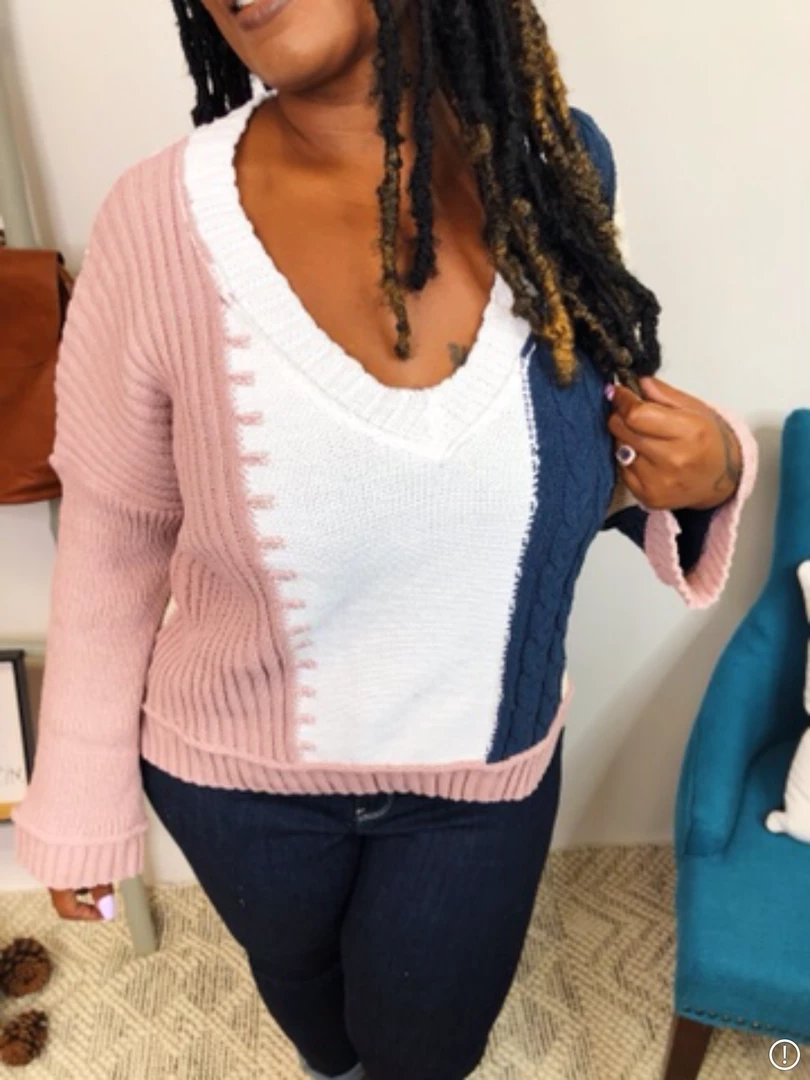 This gorgeous color block long sleeve sweater it’s so soft! It features a V-neck and the rose and navy colors, with the ivory and beige just makes the perfect match! As the chill weather it’s starting to approach, the sweater season it’s coming up too, and this one it’s the perfect piece for any occasion, day or night you will feel comfortable and warm on this amazing sweater! You can pair this sweater with leggings or jeans and you will have a super cute look!!Β