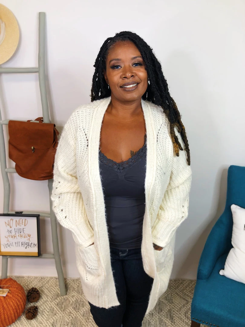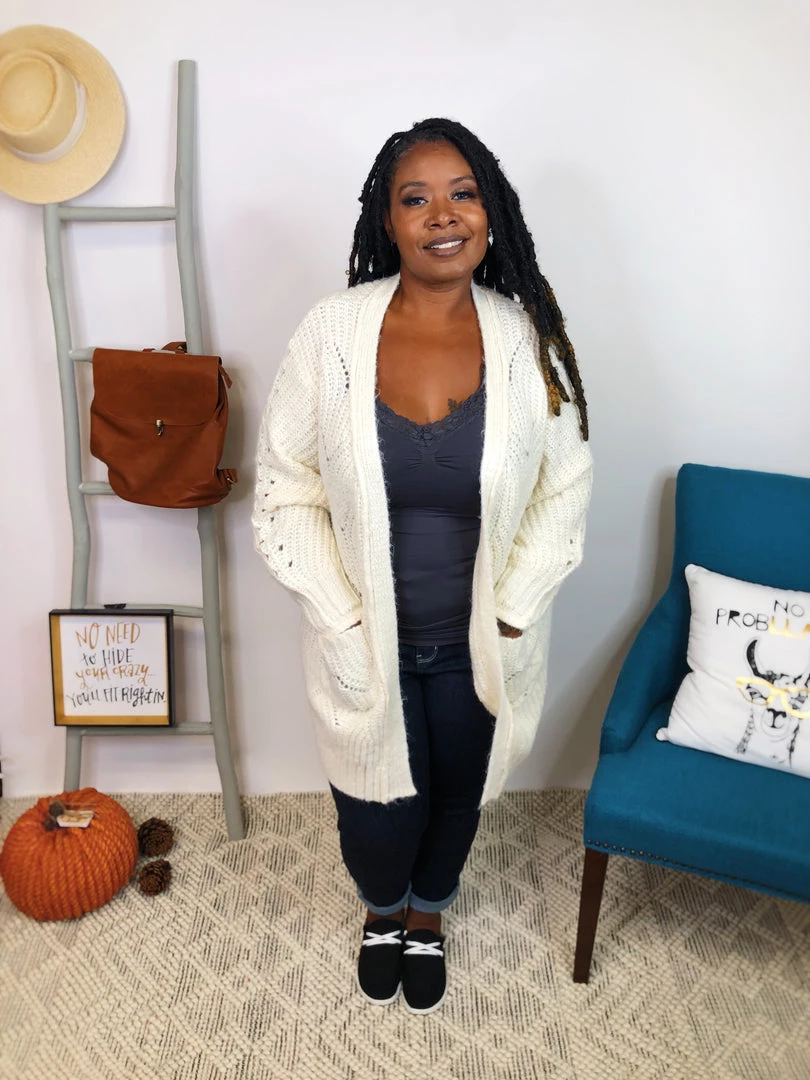 Besilica is a true Large/15 and she wears a Small in this cardigan.