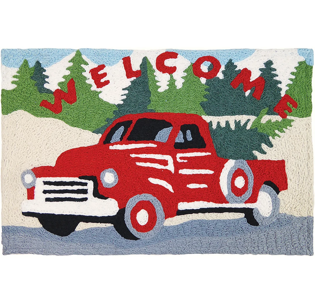 Welcome memories of choosing the perfect tree with this design featuring a Red classic truck hauling a flawless tree from the day’s adventure. The word “Welcome” appears across a forest of trees amidst snowcapped mountains. Whether outside in the cold or just inside your door’s threshold, this Jellybean® accent rug is designed to welcome all who enter.