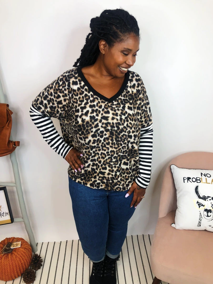 Who is ready to look absolutely gorgeous during this season with animal print and black & white striped sleeves. This is gonna be your go to long sleeve for a night out. Very light and comfortable for a fall/winter style and nice and stretchy on the arms. Material: