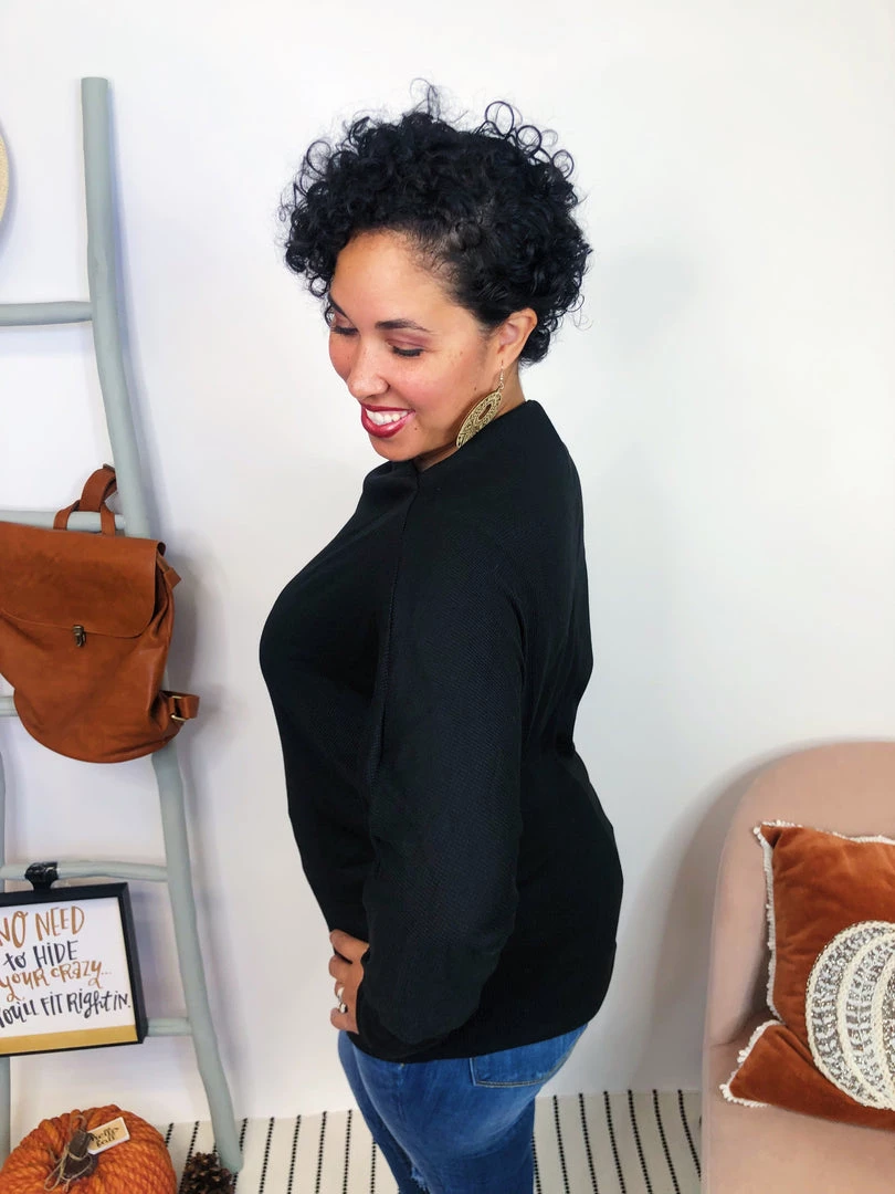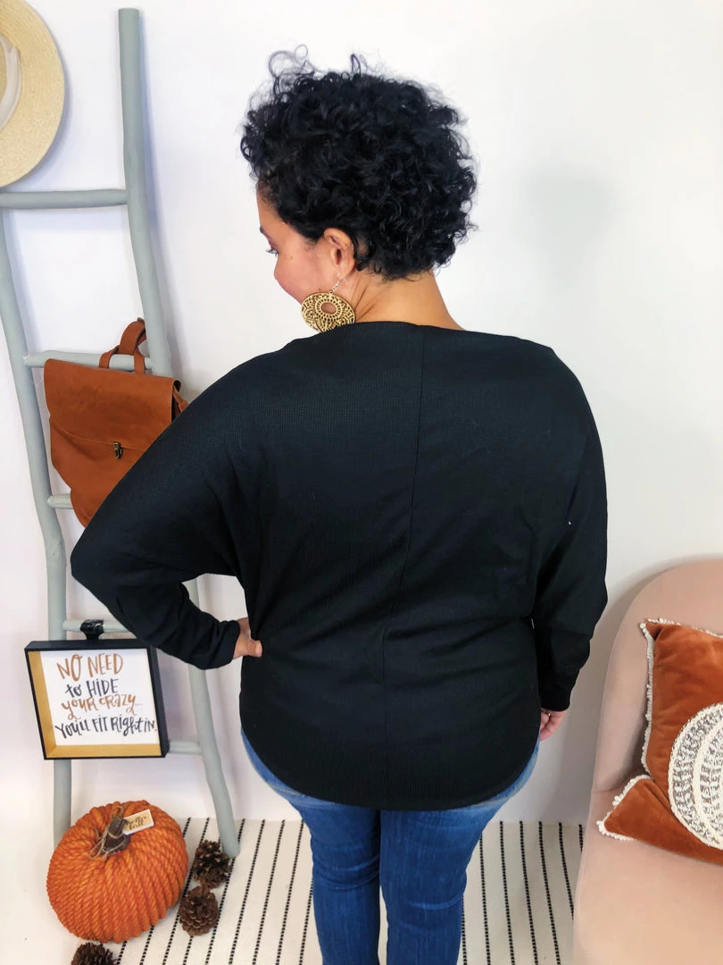 This beautiful waffle knit long sleeve dolman top, it’s just amazing. The black color makes it this top super versatile and perfect for any occasion. Dolman tops hasΒ aΒ looser fit to it which makes them super comfortable! You can pair this top with leggings, shorts or your favorite bottoms and you will have an gorgeous outfit.