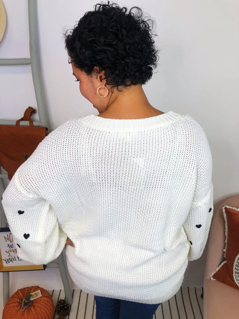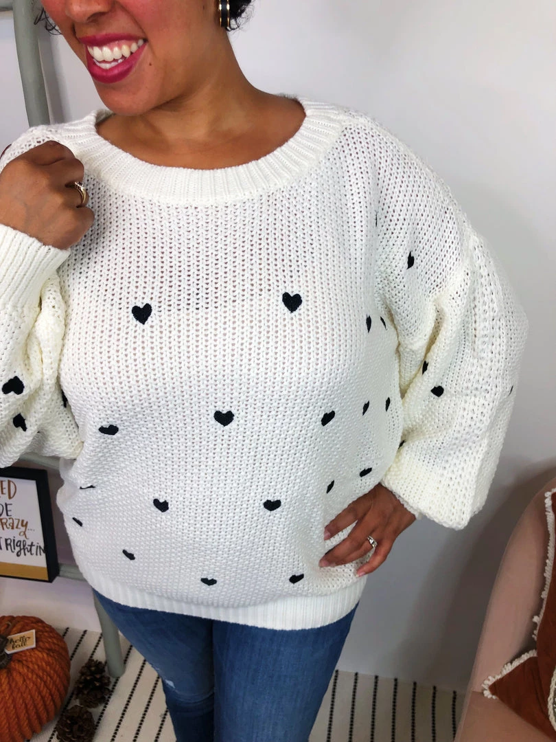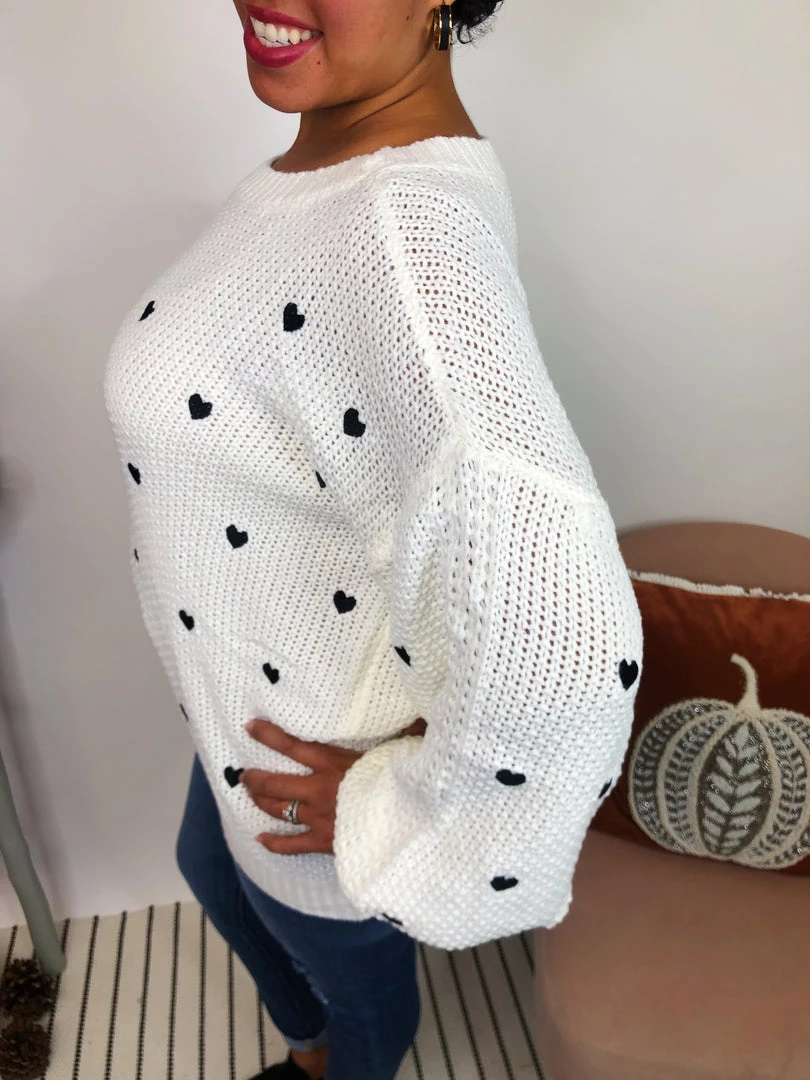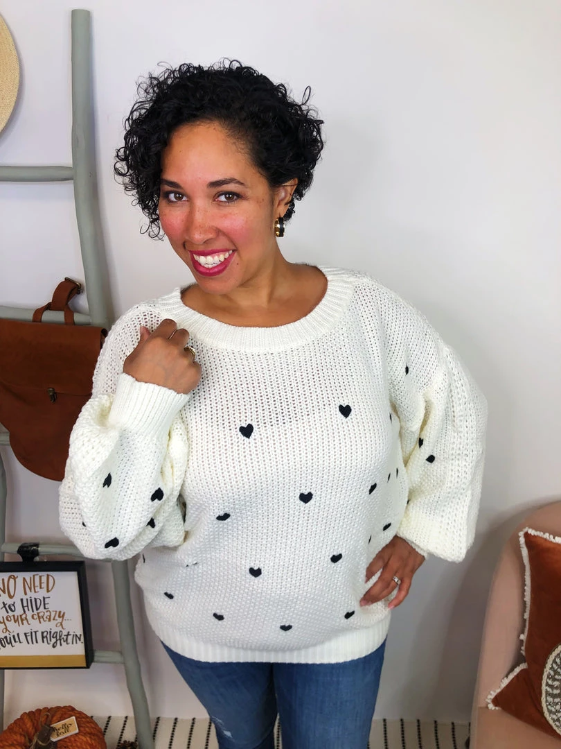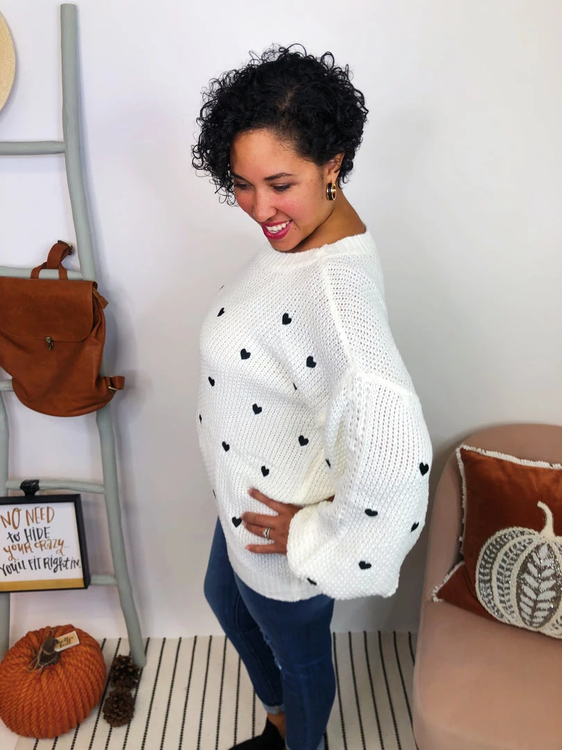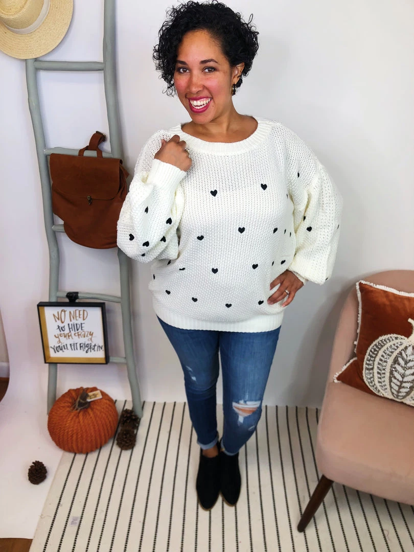 This gorgeous ivory sweater with small black hearts on it is so effortlessly chic! It is so soft and oversized so you will be so warm and cozy while wearing this. The crew neck line and loose sleeves make this the perfect sweater to dress up or dress down.