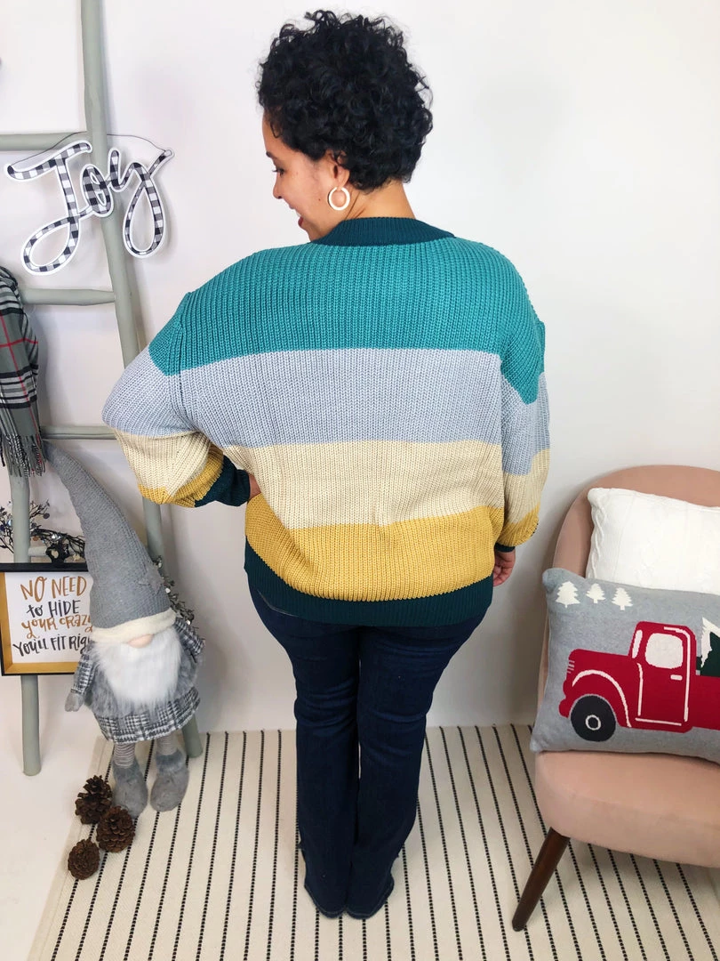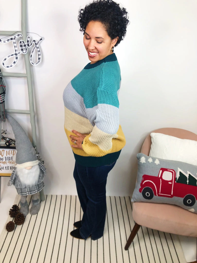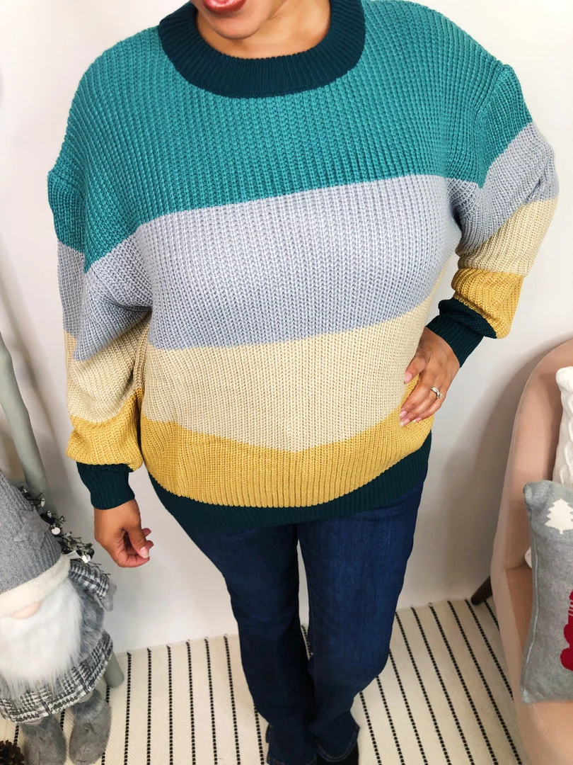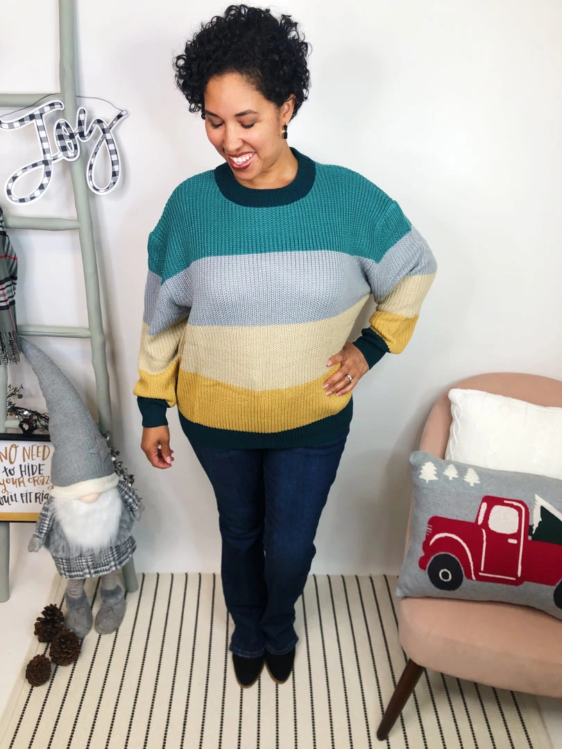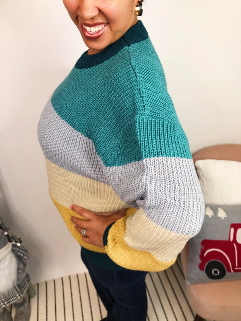 This colorblock sweater is gorgeous and oh so soft! The crew neck line is a dark teal that fades into a lighter teal, then grey, then sand and a deep latte color before ending on the same dark teal as the neckline. The colors are breathtaking and this sweater is no different!