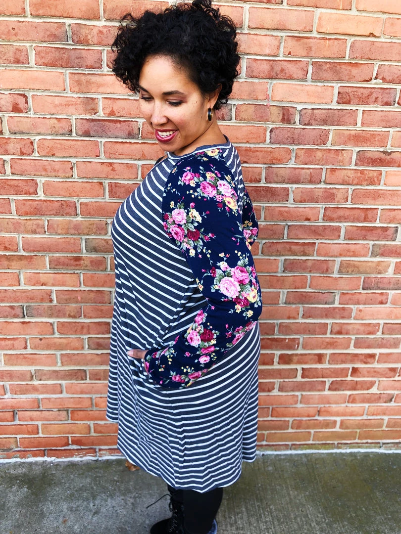 This beautiful shirt dress has long sleeves that are floral print on a navy background. The main part of the dress is a dark heather grey and has white stripes on it. This dress has a super cute keyhole in the front to add a splash of spice to this gorgeous dress. It’s so soft and comfortable and has AMAZING stretch!Β