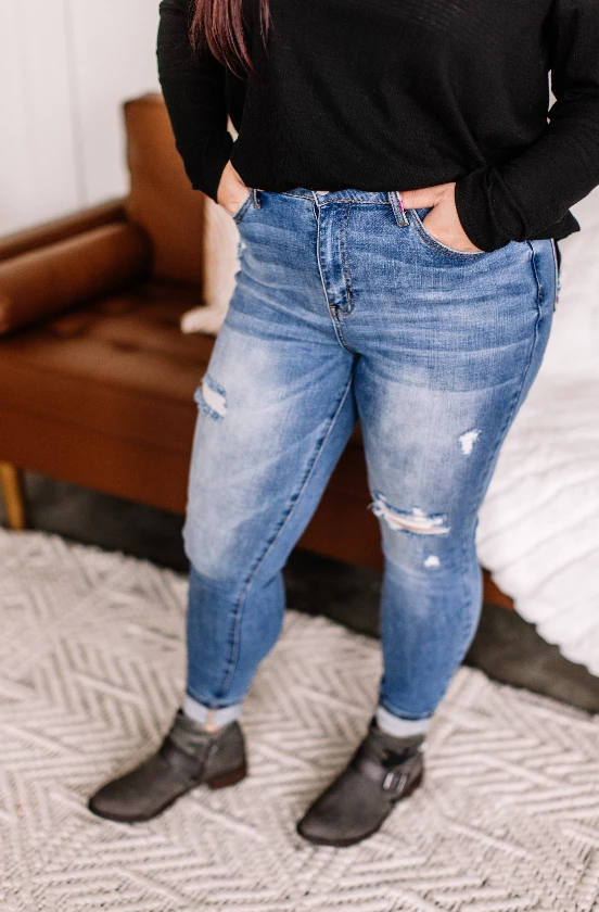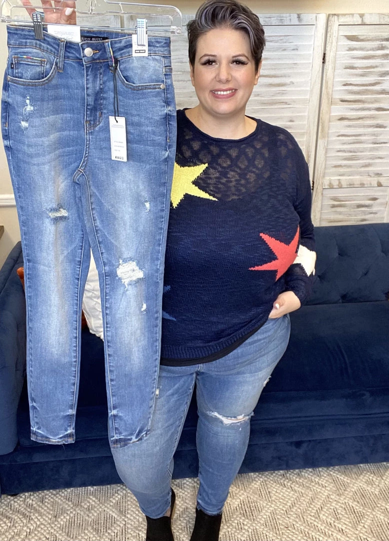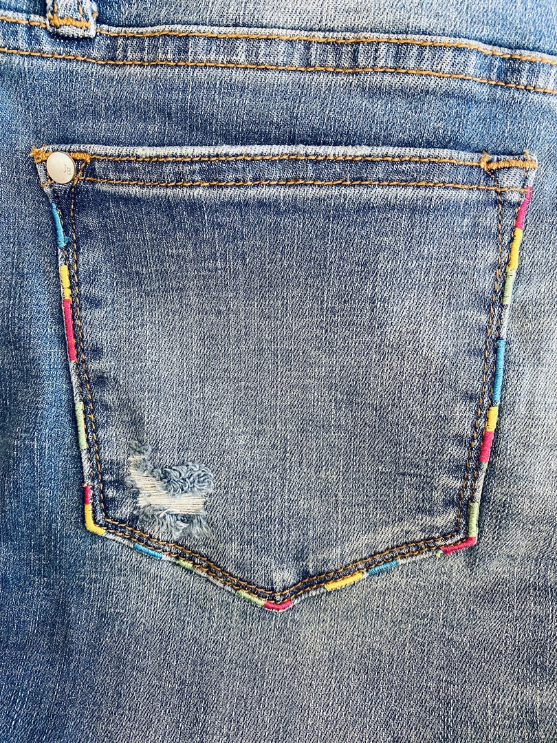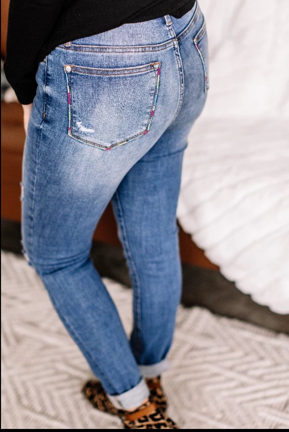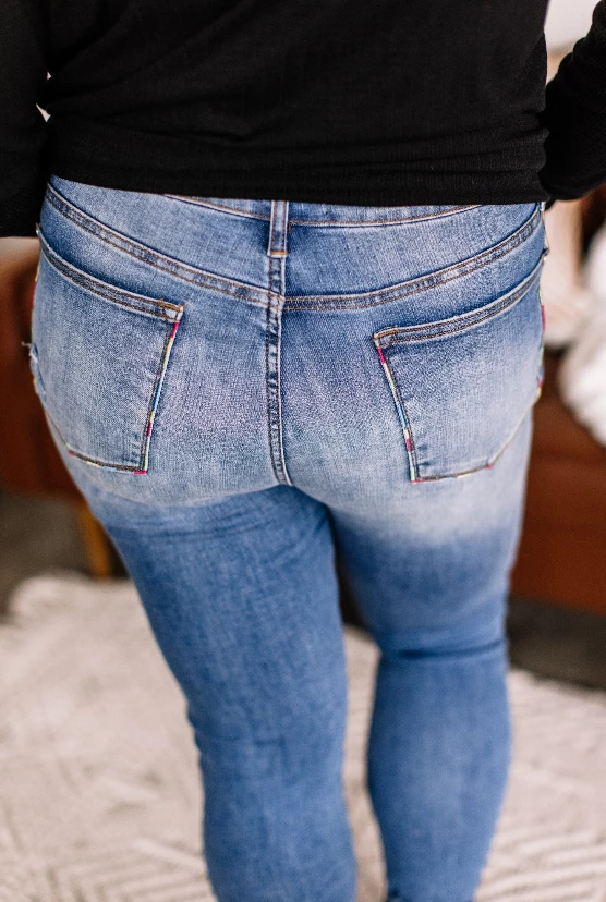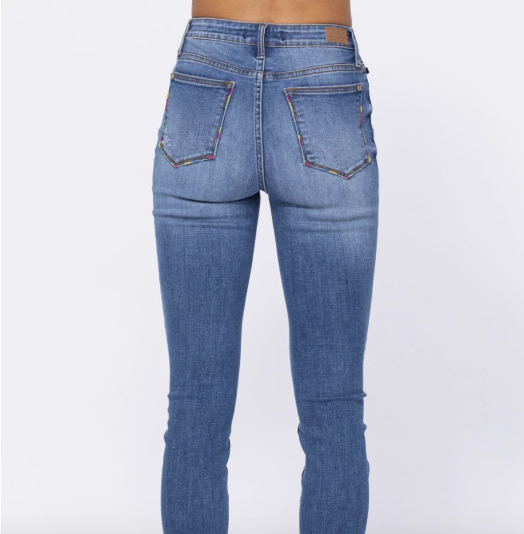 We are completely in love with this gorgeous pair of Judy Blue jeans!Β Medium wash, mid-rise with that classic Judy Blue stretch that is AMAZING, the embroidery on these adds another level of incredible to these jeans. The LED style stitching on the pockets in various colors adds a bit of sass and fun to these lightly distressed skinny jeans. Snag these and light up your day and night every time you wear them!Β