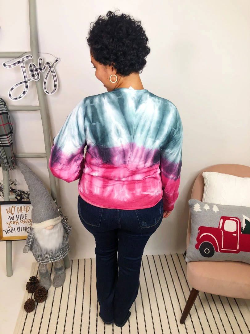 This gorgeous tie dye POL top is perfect!! It has a overlay front and long sleeves. The color of this top is just amazing, it’s a tie dye print pink and acai. This beautiful top is so comfortable and cozy! It is the perfect match for your legging or your favorite jeans.Β
