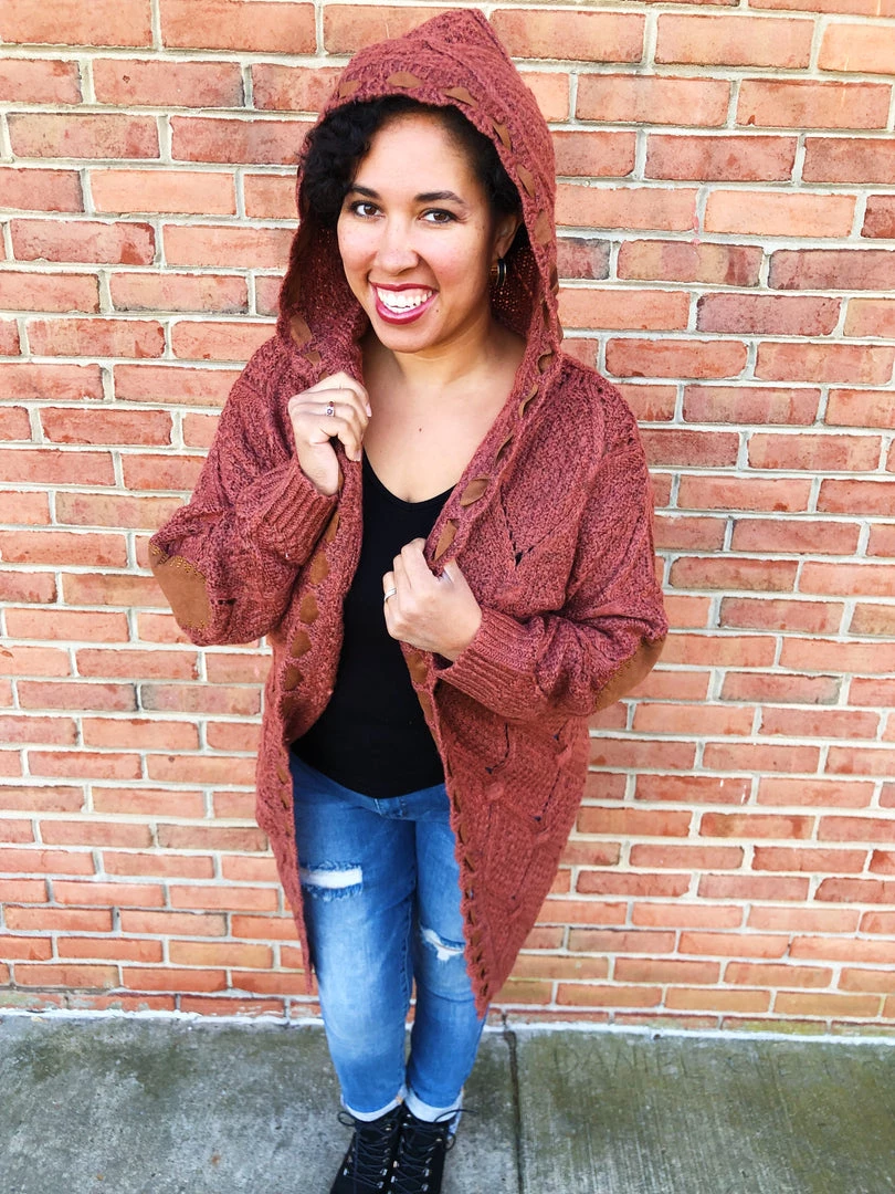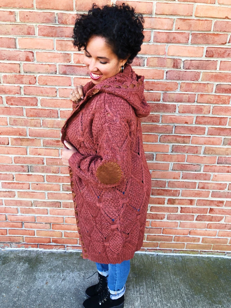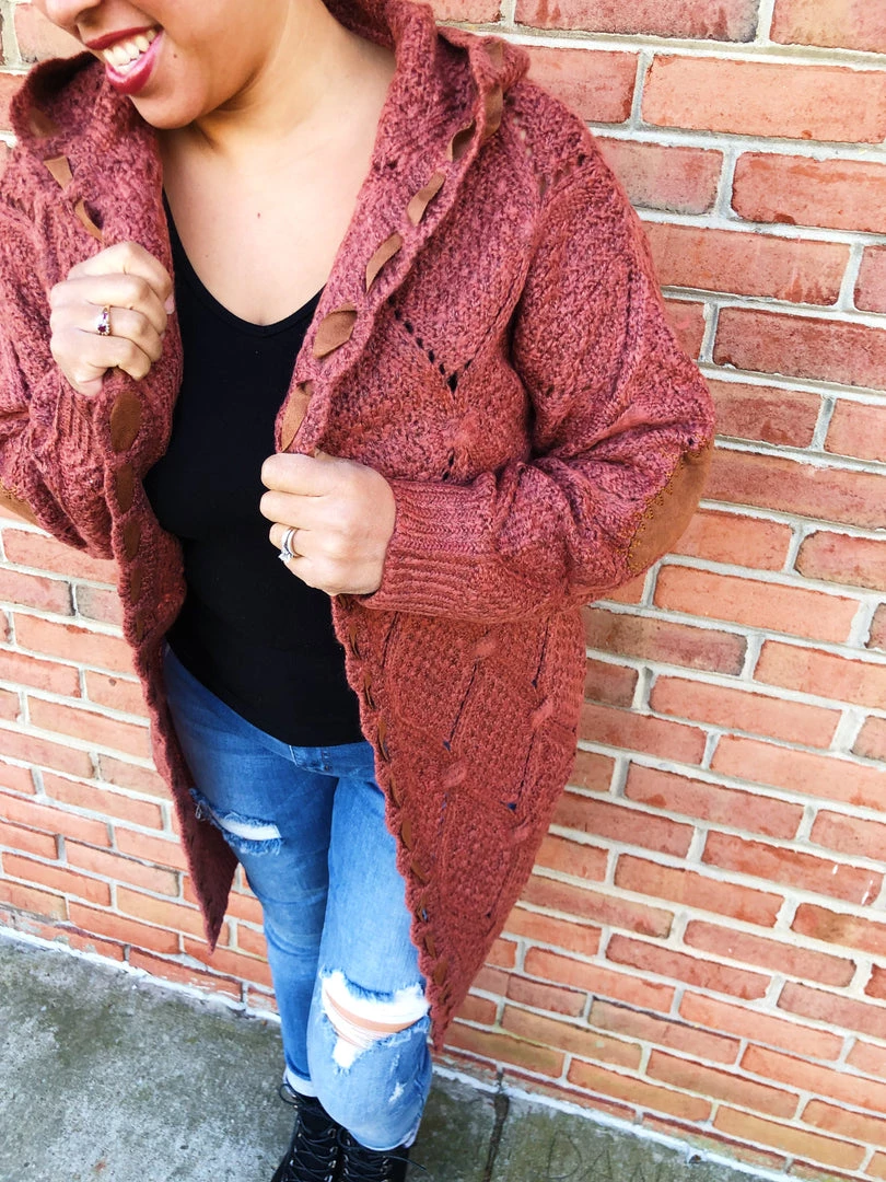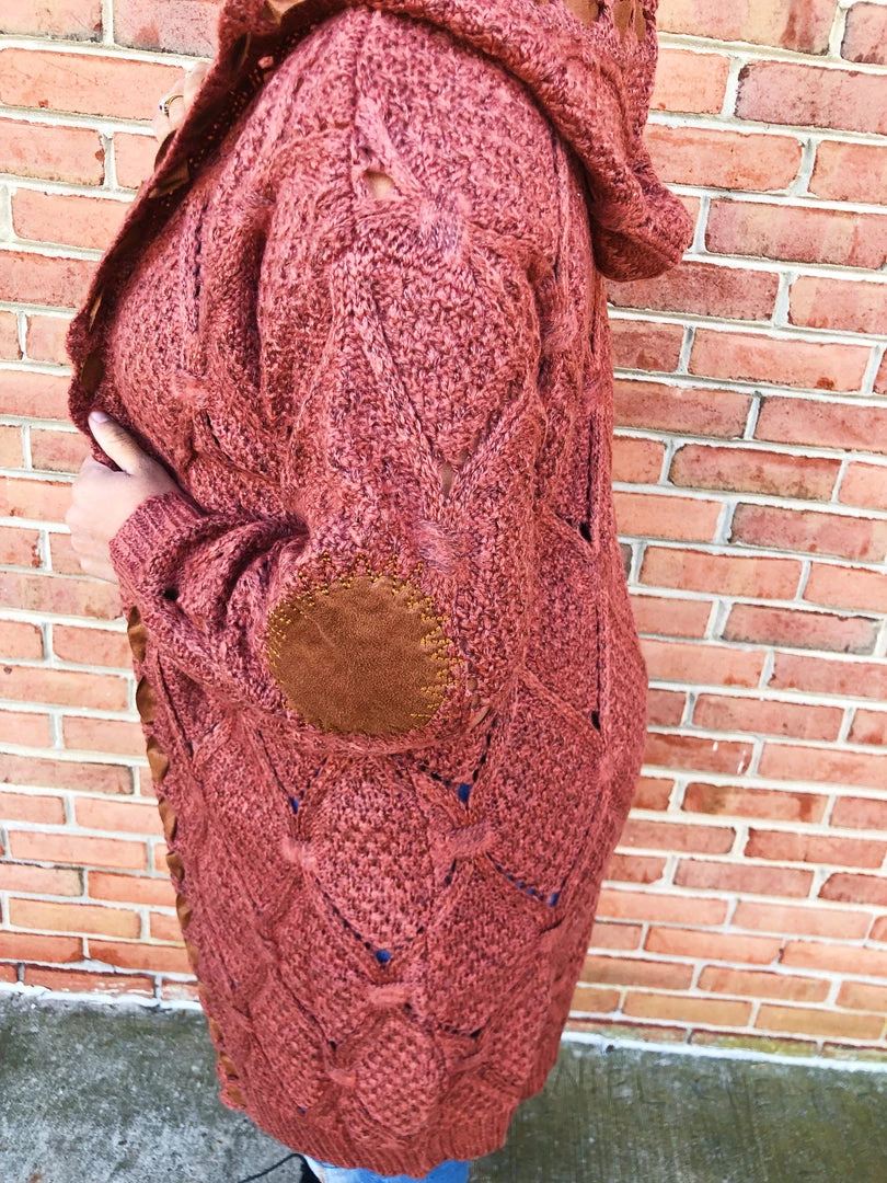 This stunning cardigan by POL is a rustic brick color with brown suede ribbon laced throughout the sides. The elbow patches are a gorgeous suede and add a subtle detail to this already breathtaking cardigan. The diamond weave and oversized fit of this cardigan give this a homey vibe that makes it super comfy.