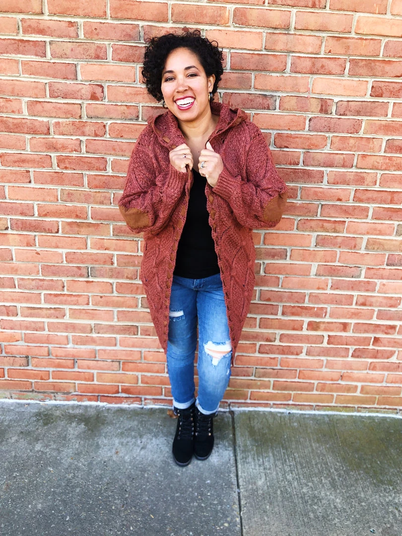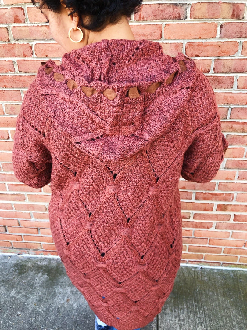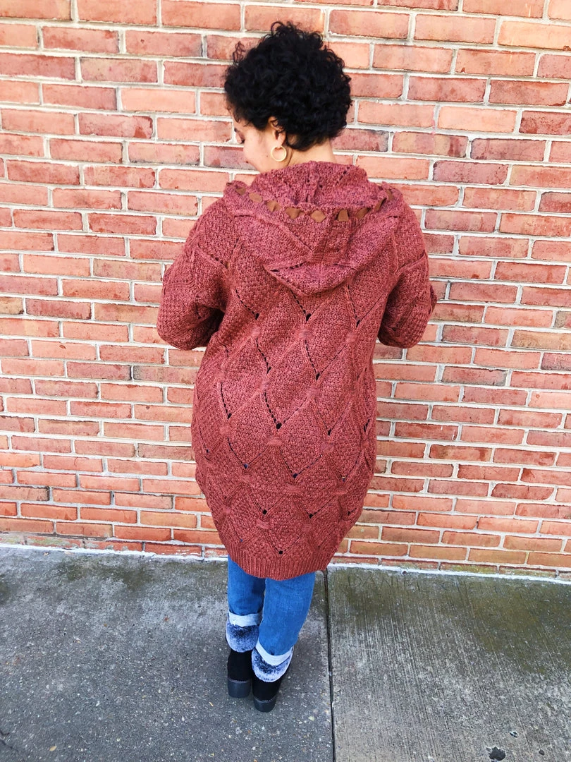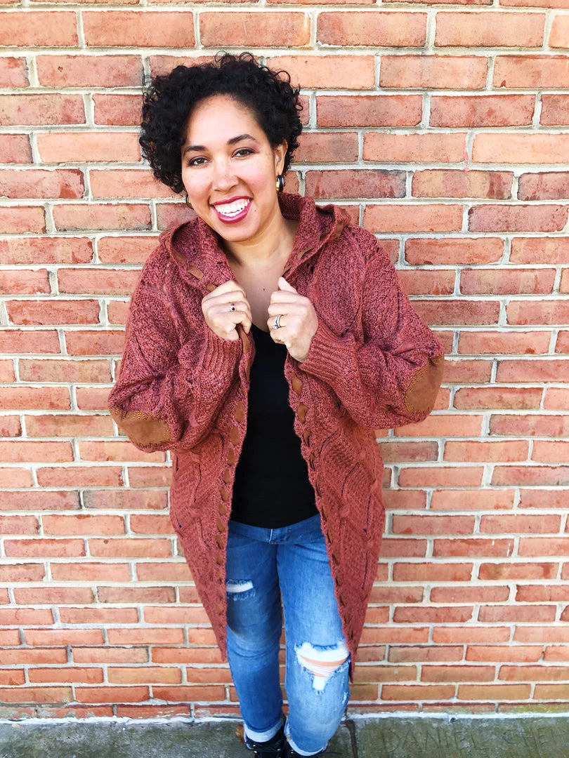 This stunning cardigan by POL is a rustic brick color with brown suede ribbon laced throughout the sides. The elbow patches are a gorgeous suede and add a subtle detail to this already breathtaking cardigan. The diamond weave and oversized fit of this cardigan give this a homey vibe that makes it super comfy.