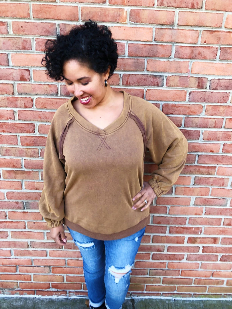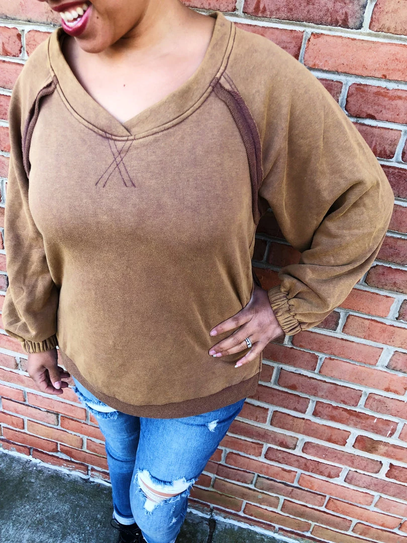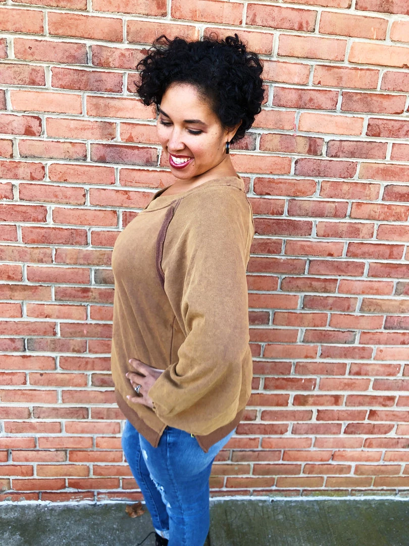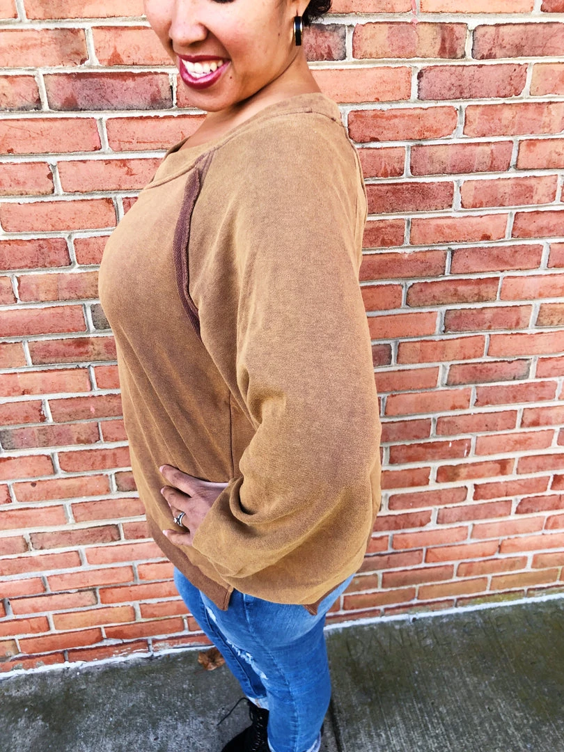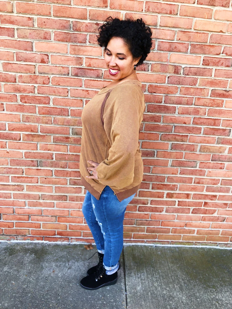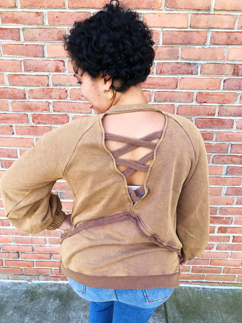 This is a really cute and super comfortable POL pullover. It features some raw hem details and a criss cross on the back, that it’s just perfect! The material it’s super cozy and the beautiful chocolate mousse color makes your new favorite fall piece, no doubt that you will love this pullover. You can pair it with leggings, joggers or your favorite jeans and you will have a chic and cute outfit.Β
