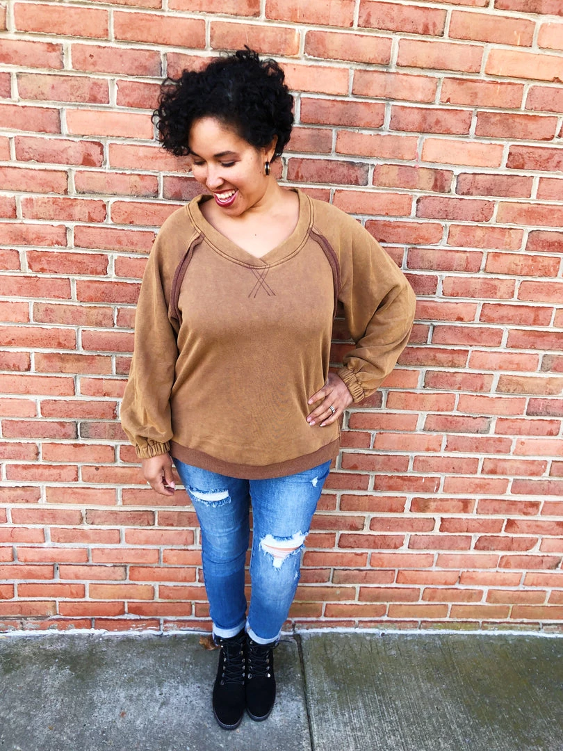 Iris is a true 2XL/18W and she wears a Large in this pullover.