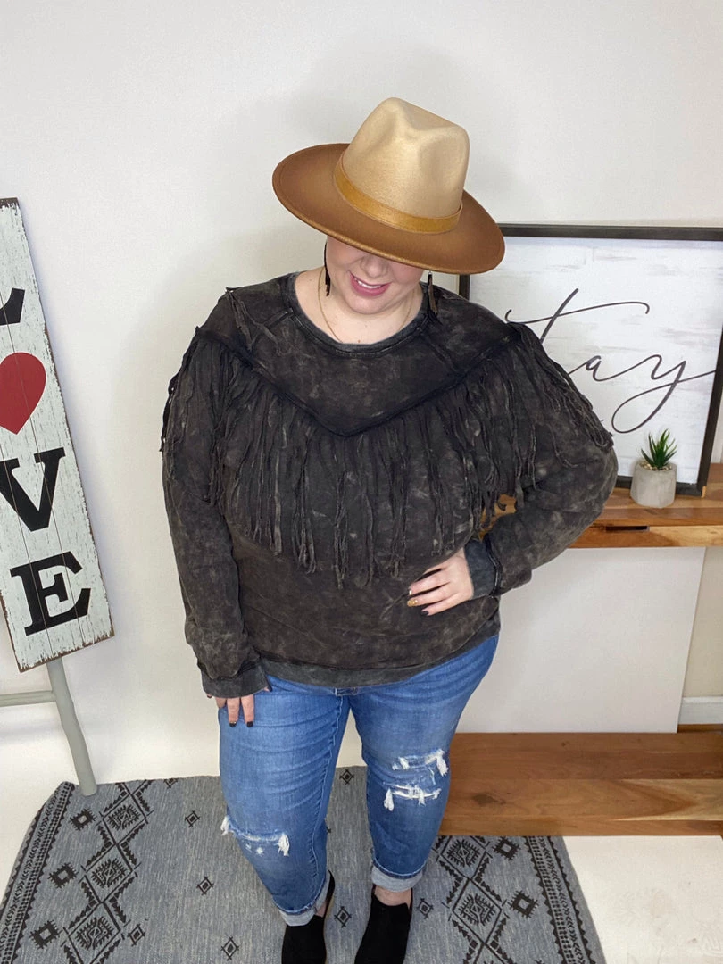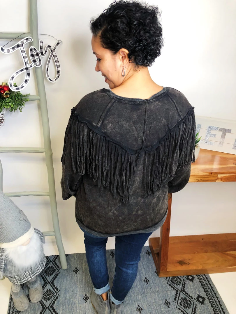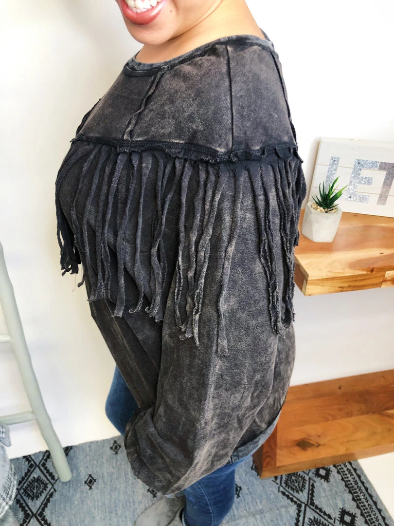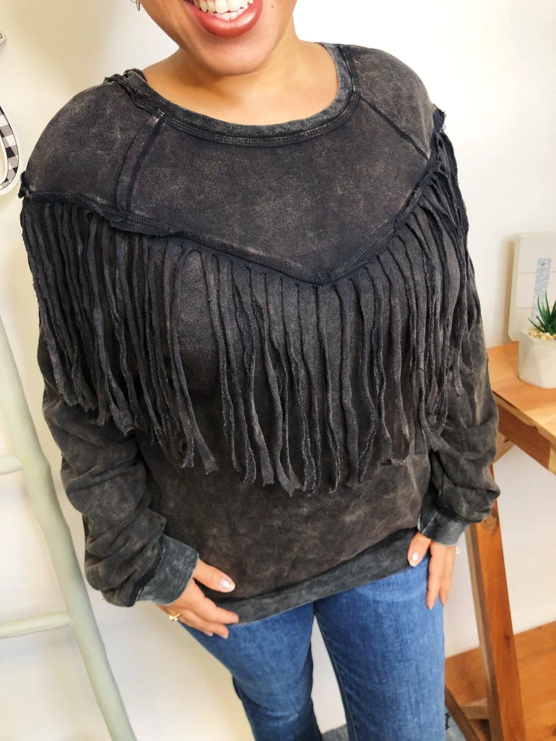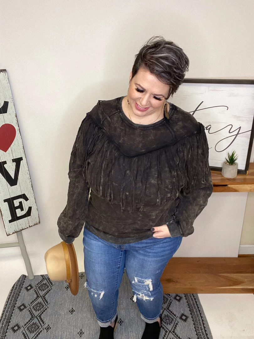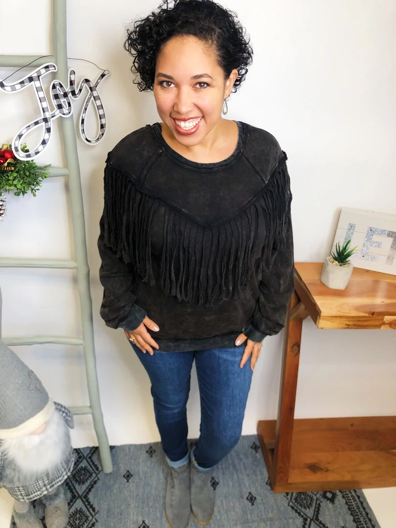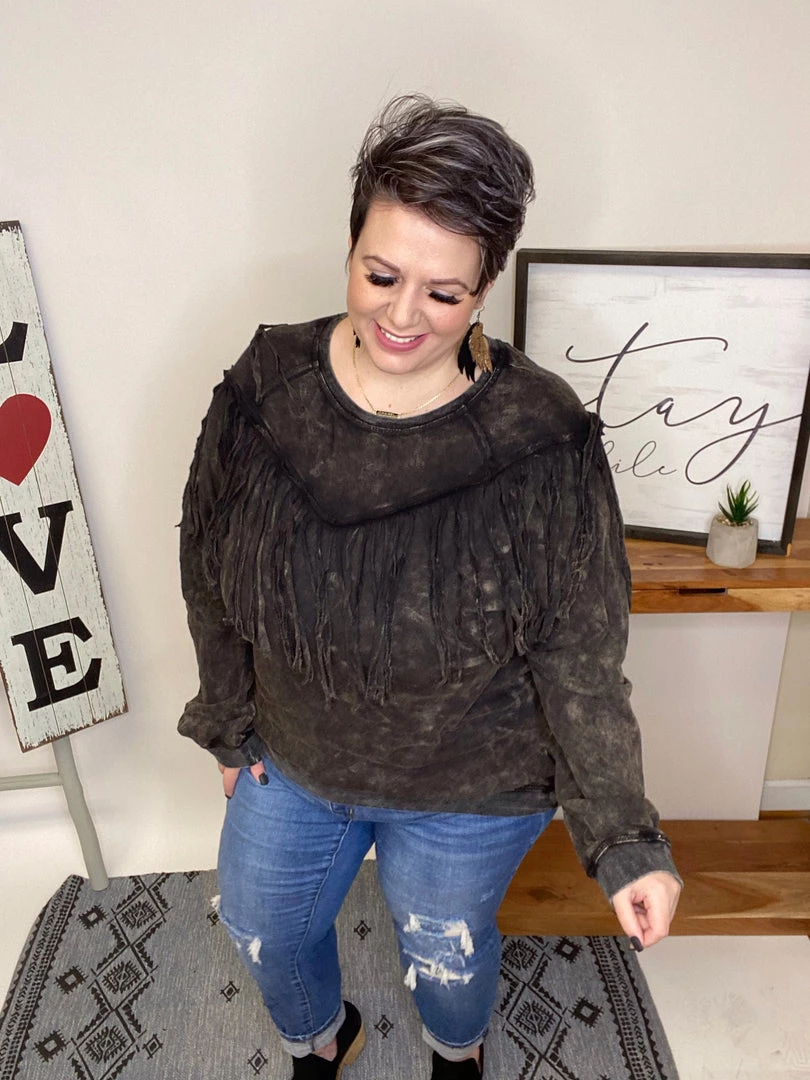 This top is beautiful!! It has a washed solid print french terry featuring long sleeves, round neckline, drop shoulder and fringe details!!! And the fabric in this top is very soft and warm! You’re gonna love owning this!