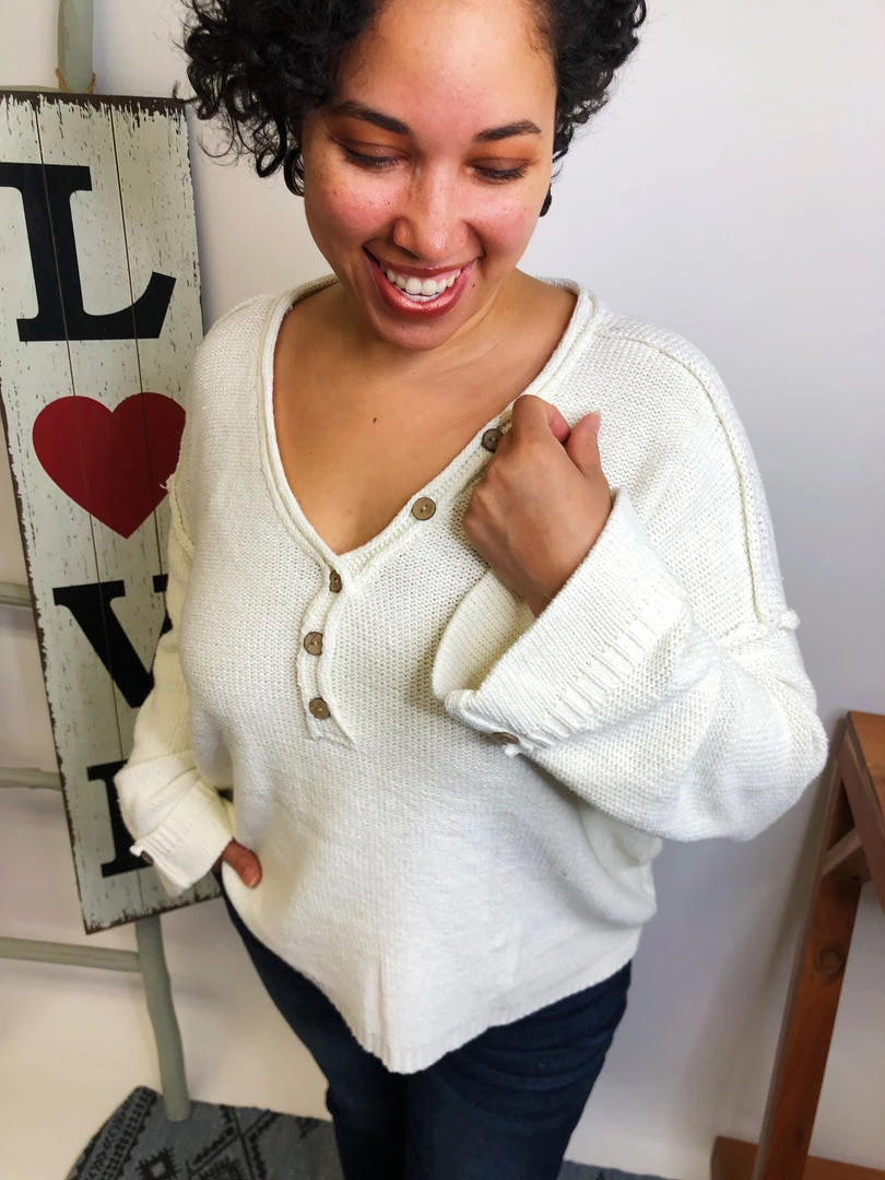 This sweater is gorgeous!!! It has long sleeves, solid knit with a v-neck featuring bell sleeves and non-functional buttons!!! The fabric is a medium weight sweater knit!!! This sweater is gonna make your outfit looking amazing! You won’t regret owning this!!!