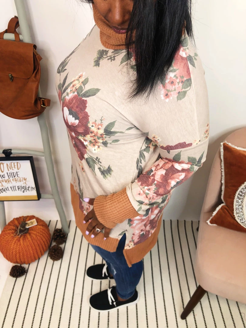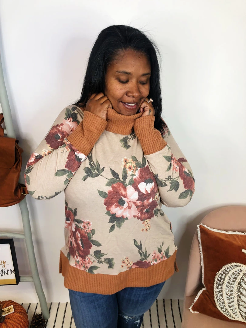 This gorgeous long sleeve floral print top features a cowl neck in a solidΒ tan trim. The trim continues on the sleeve cuffs and the bottom hem. The main part of the sweater is a stunningΒ ivory color with vibrant flowers inΒ burgundyΒ on it. This super soft and comfortable top is a splash of brightness on dreary days.Β