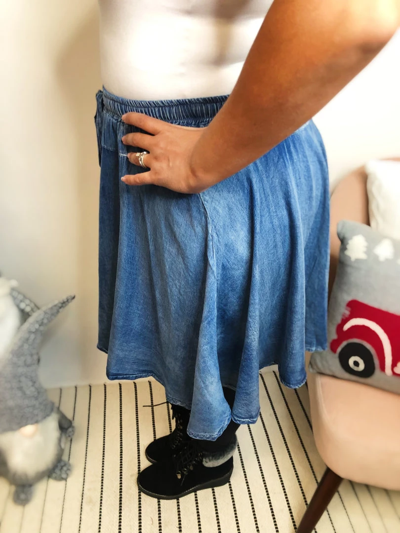 This skirt is SO cute!! It has shorts lining and a drawstring. This skirt has a denim blue wash and a chambray flare style! It’s gorgeous and very flowy! And the fabric in this skirt is really soft and lightweight! You’ll look fantastic wearing this!Β