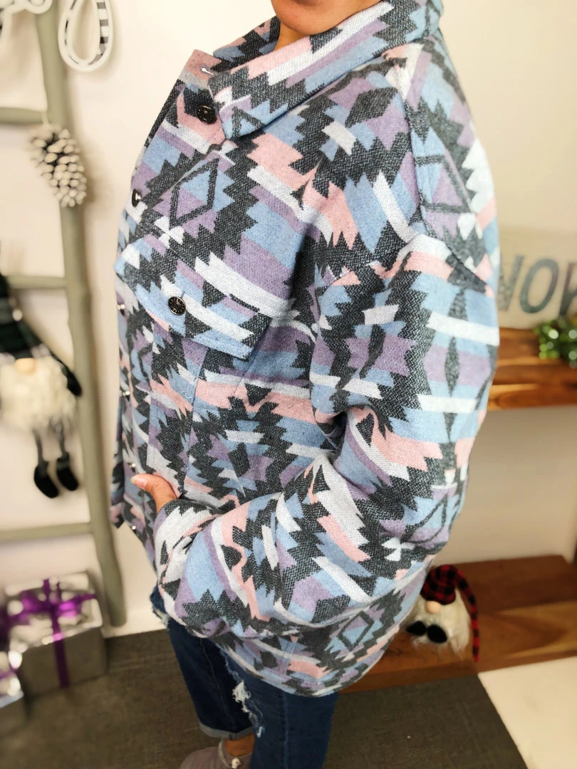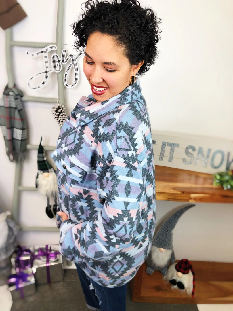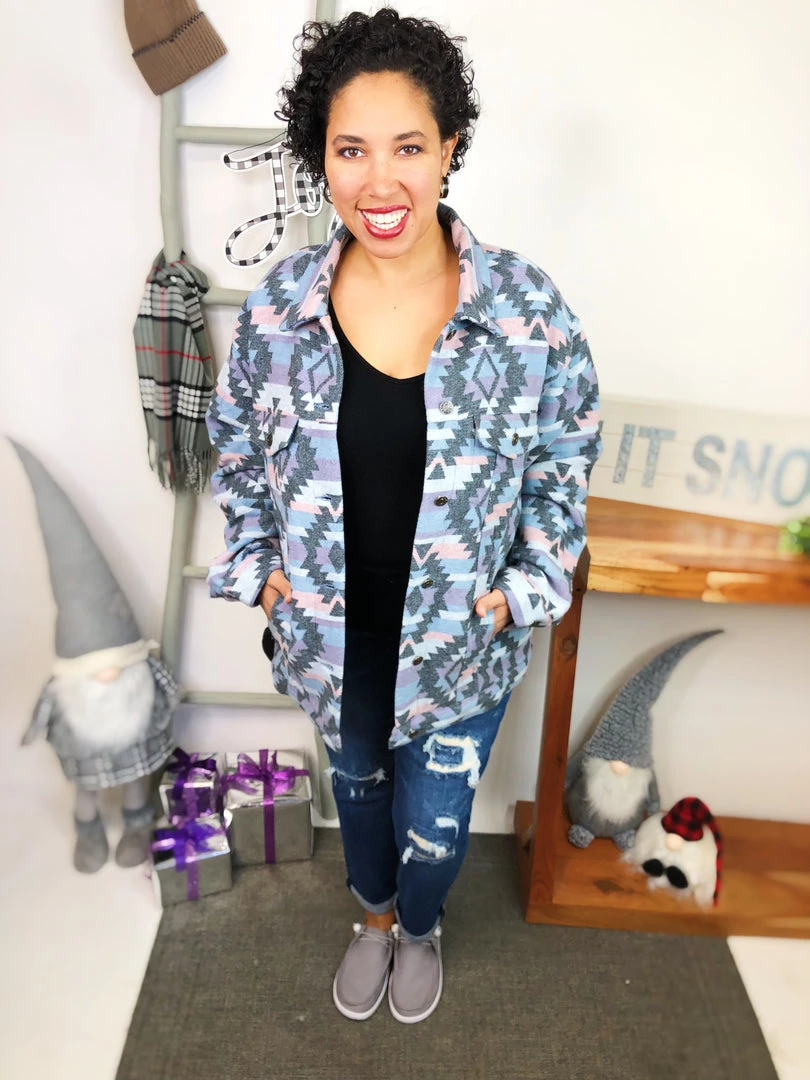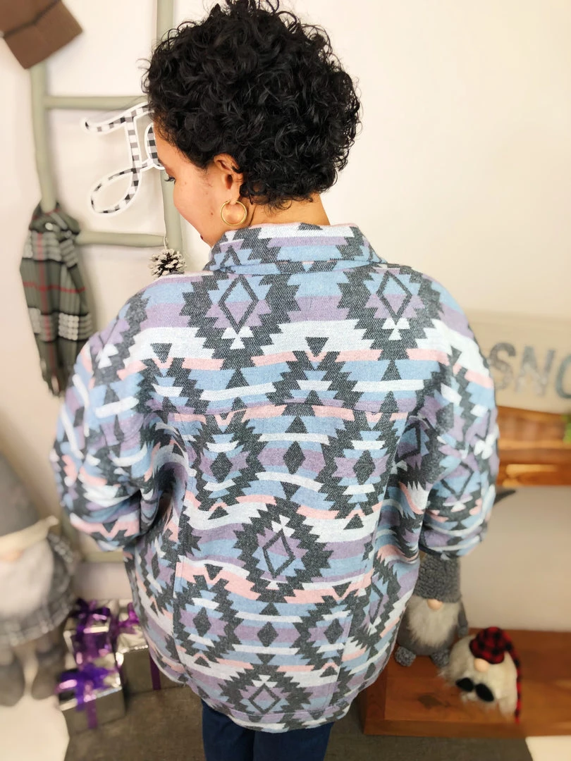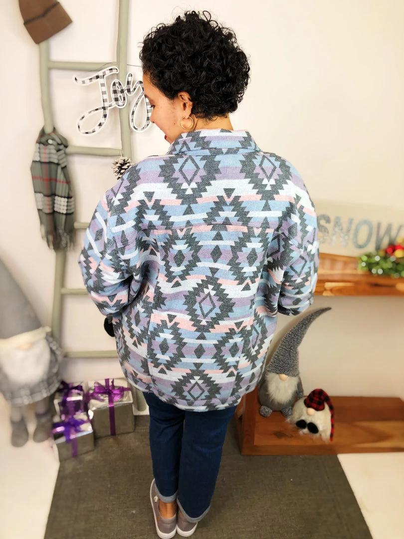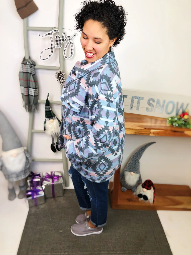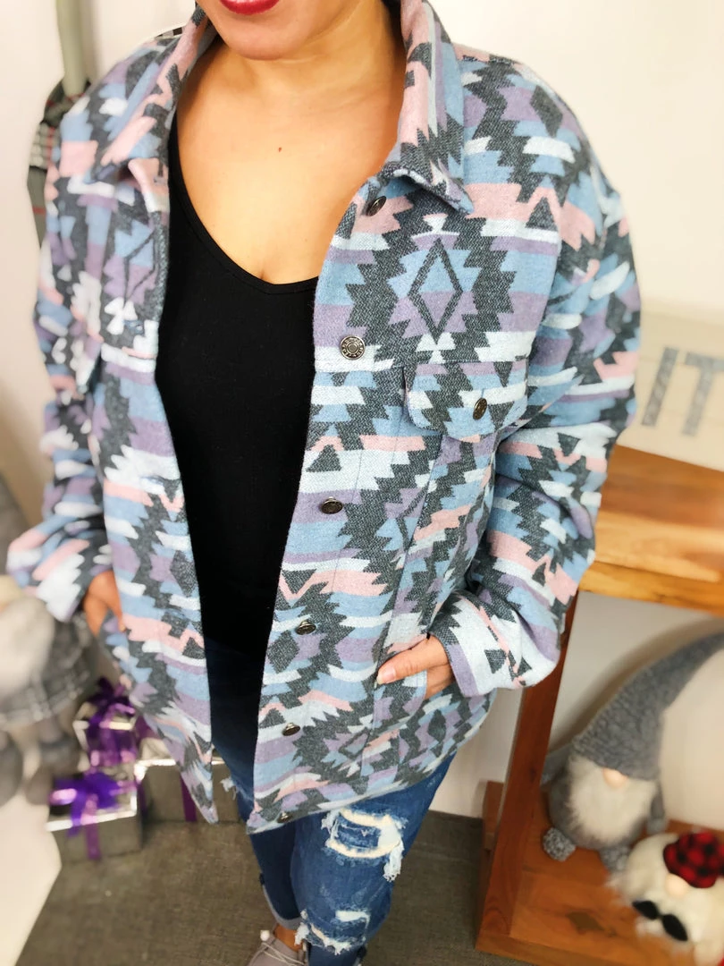 That’s a beautiful piece to have in your closet! This zacquard printed denim jacket is adorable! It has blue, purple and grey pattern geometric colors all of it! This is definitely a masterpiece to own! And the material in this jacket is so warm and soft! You’re gonna adore it!