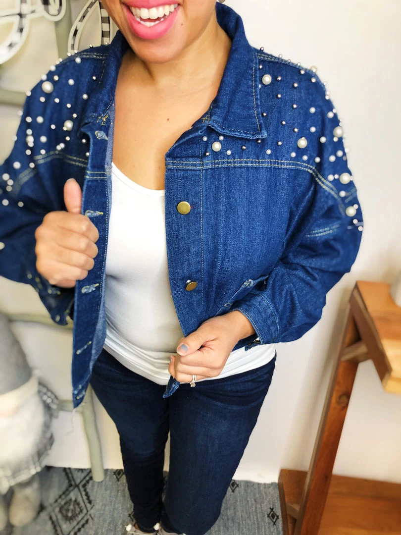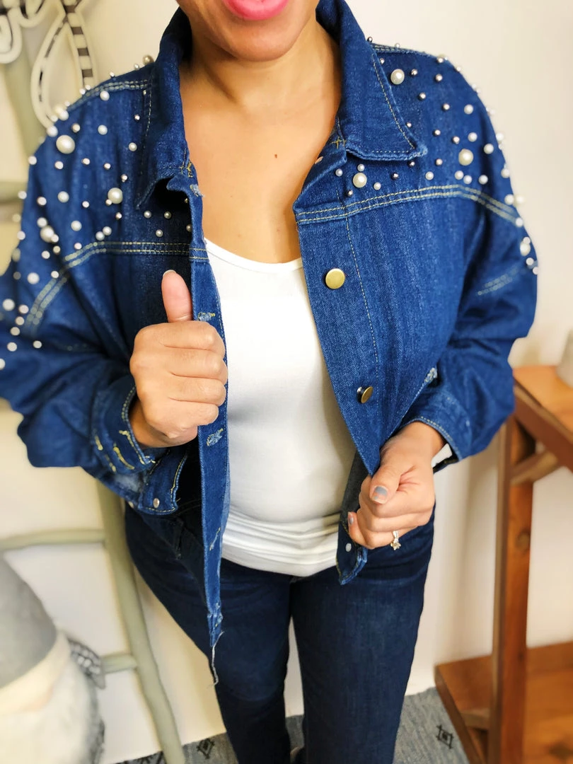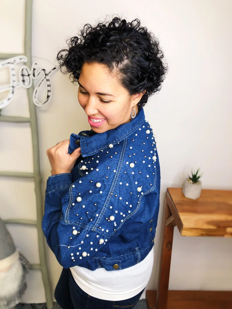 This denim jacket is gorgeous!!! It is a cropped style with beautiful pearls in its shoulders! It also has a stylish design with buttons at the back and great front pockets! It’s a really lightweight denim and it feels amazing! You gotta own this!Β