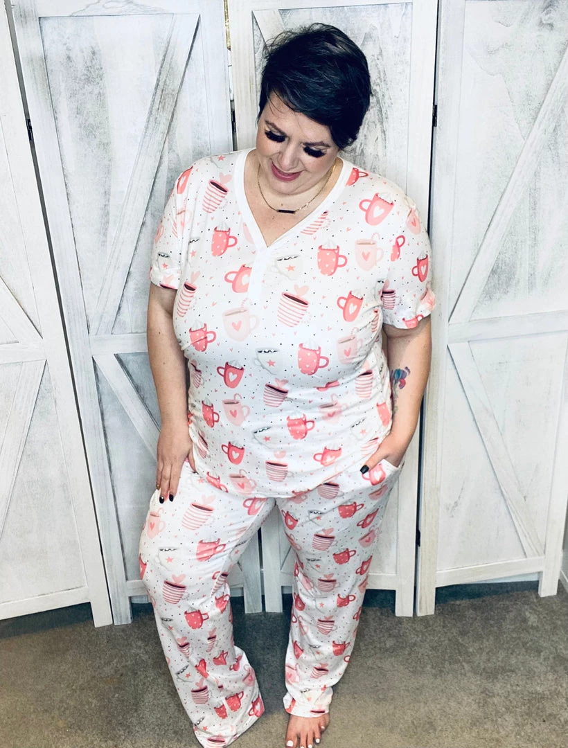 These daily wear pajamas are SO beautiful!!! It features a v-neckline with four small buttons!!! And the bottoms features pockets and a drawstring!!! It also has multiples cups of latte and hearts printed on it!!! It’s just the most amazing pajamas ever! You’re gonna love it!Β