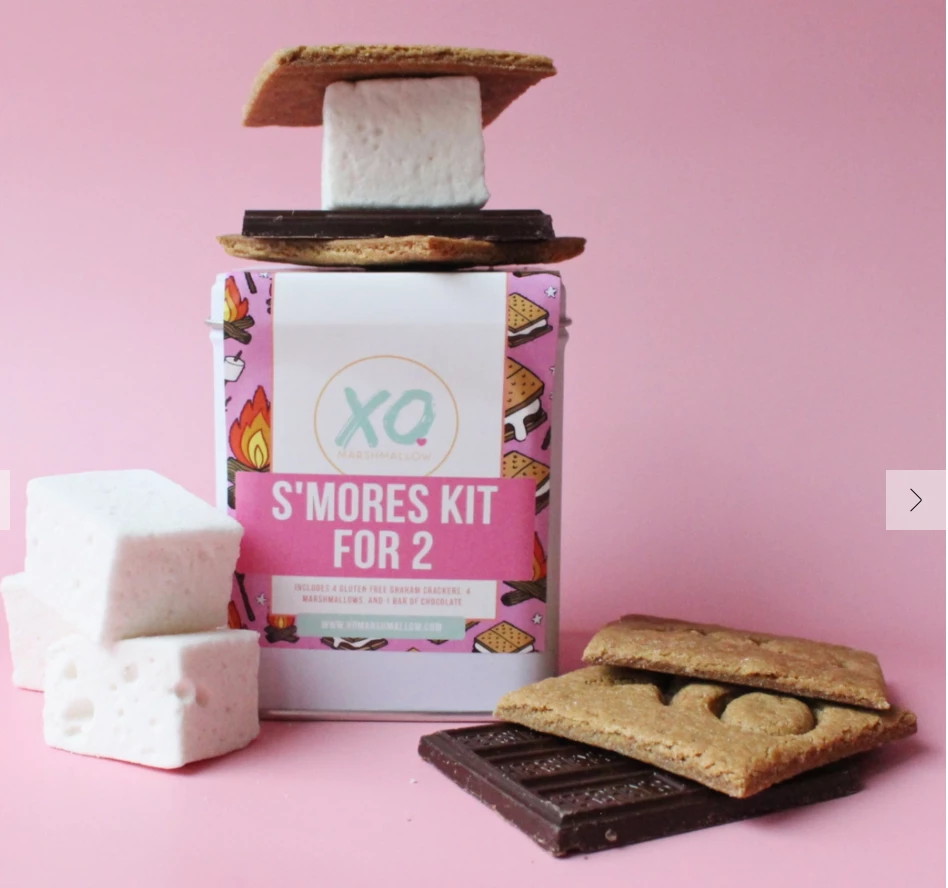 This kit is packaged for shipping and gifting in an adorable tin, making it the perfect treat to enjoy at home or send someone you care about a little s’more love. Your S’mores Kit for 2 comes with: – 4 gourmet vanilla bean XO marshmallows – 1 bar of Hershey’s chocolate – 4 homemade xo gluten free grahams