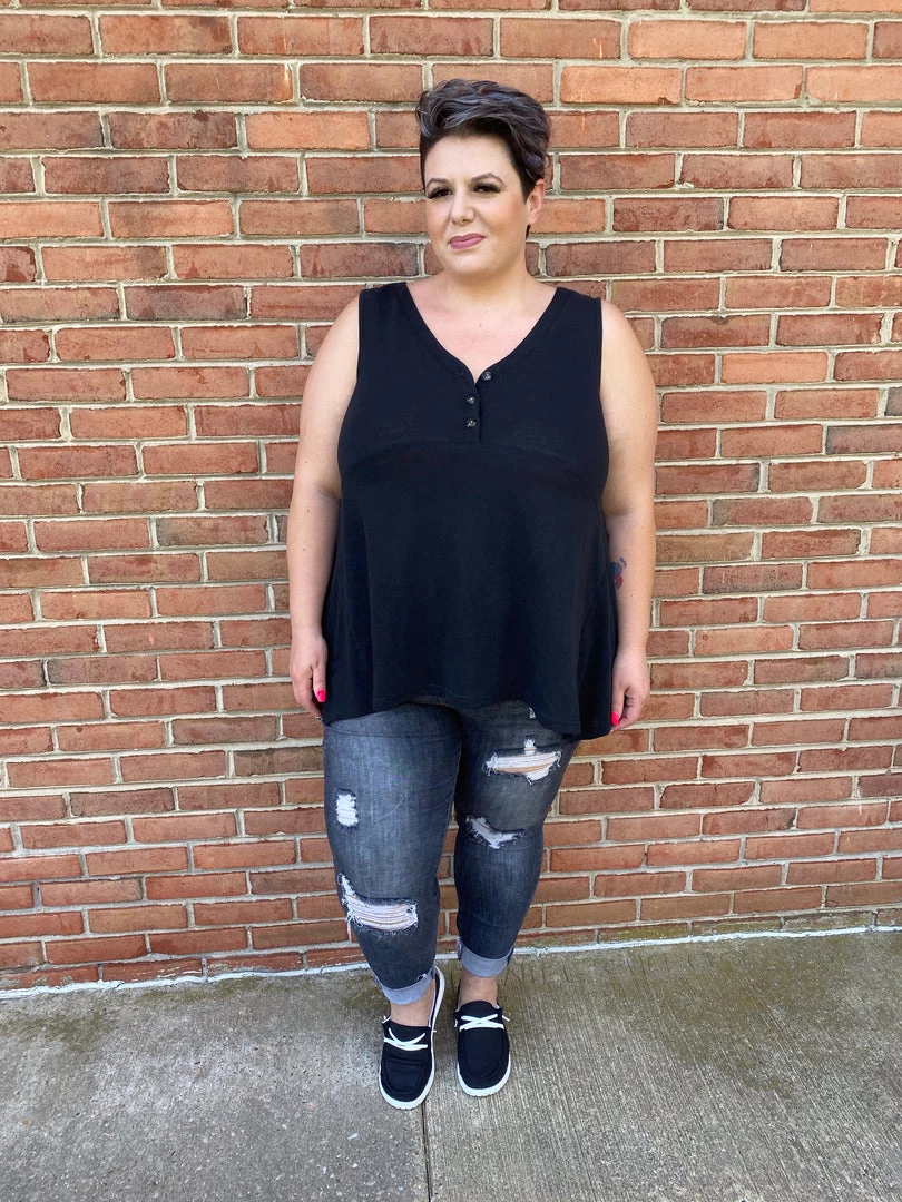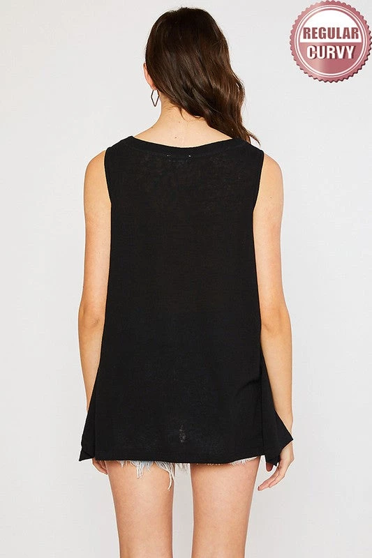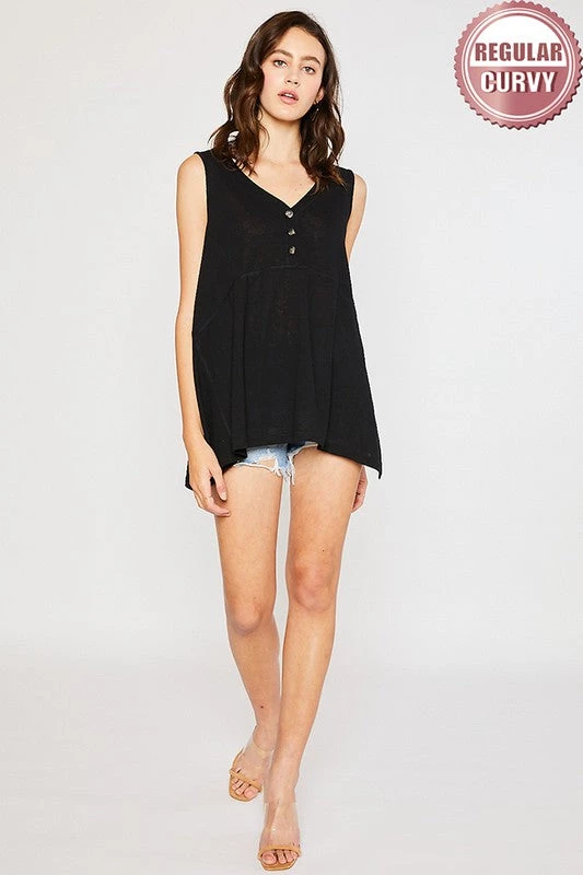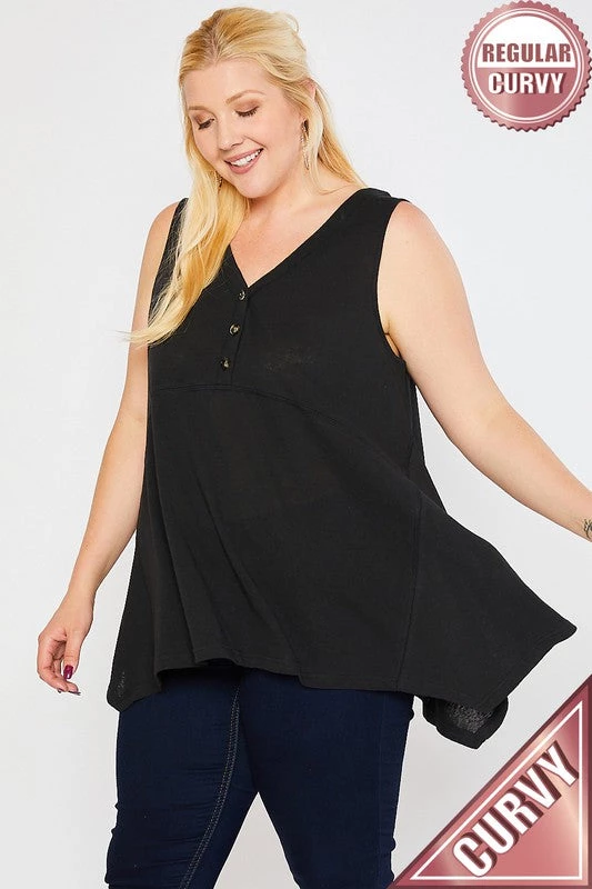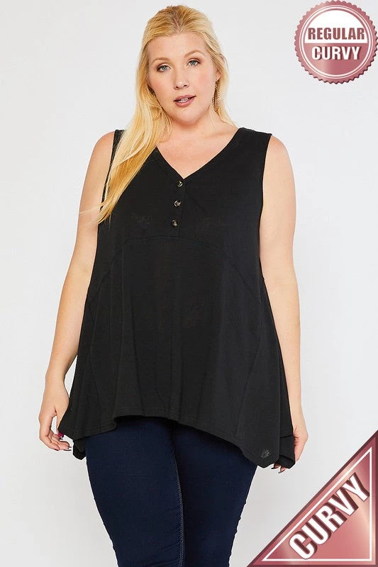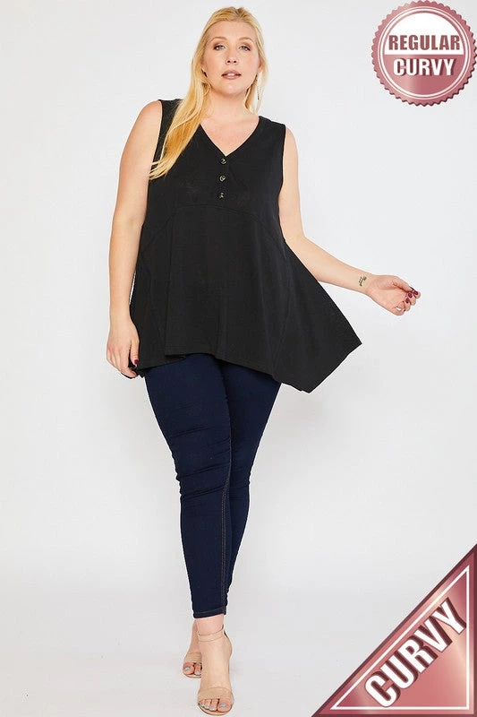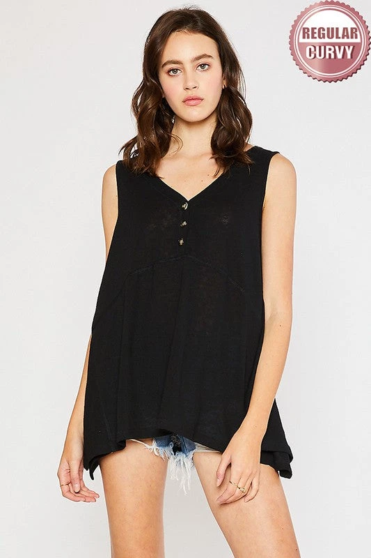 V-NECK, PLACKET FRONT WITH BUTTON, SLEEVELESS, TUNIC LENGTH,