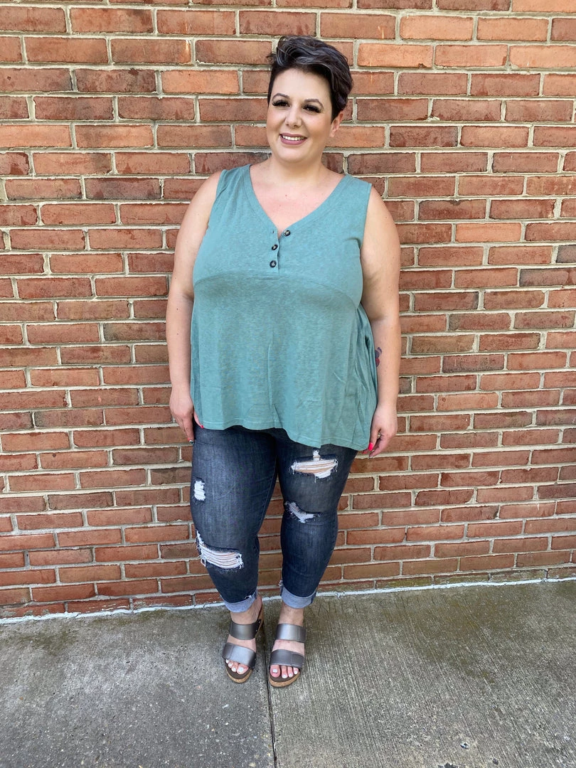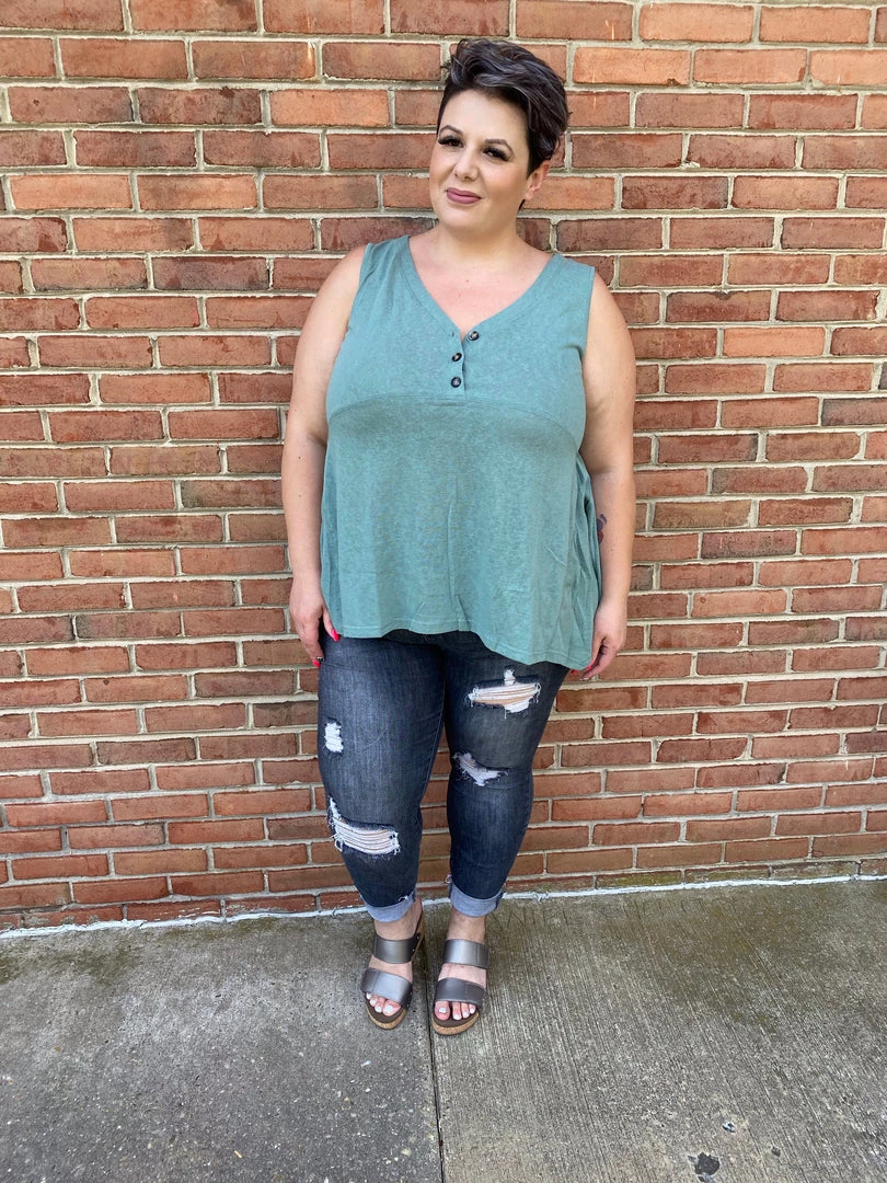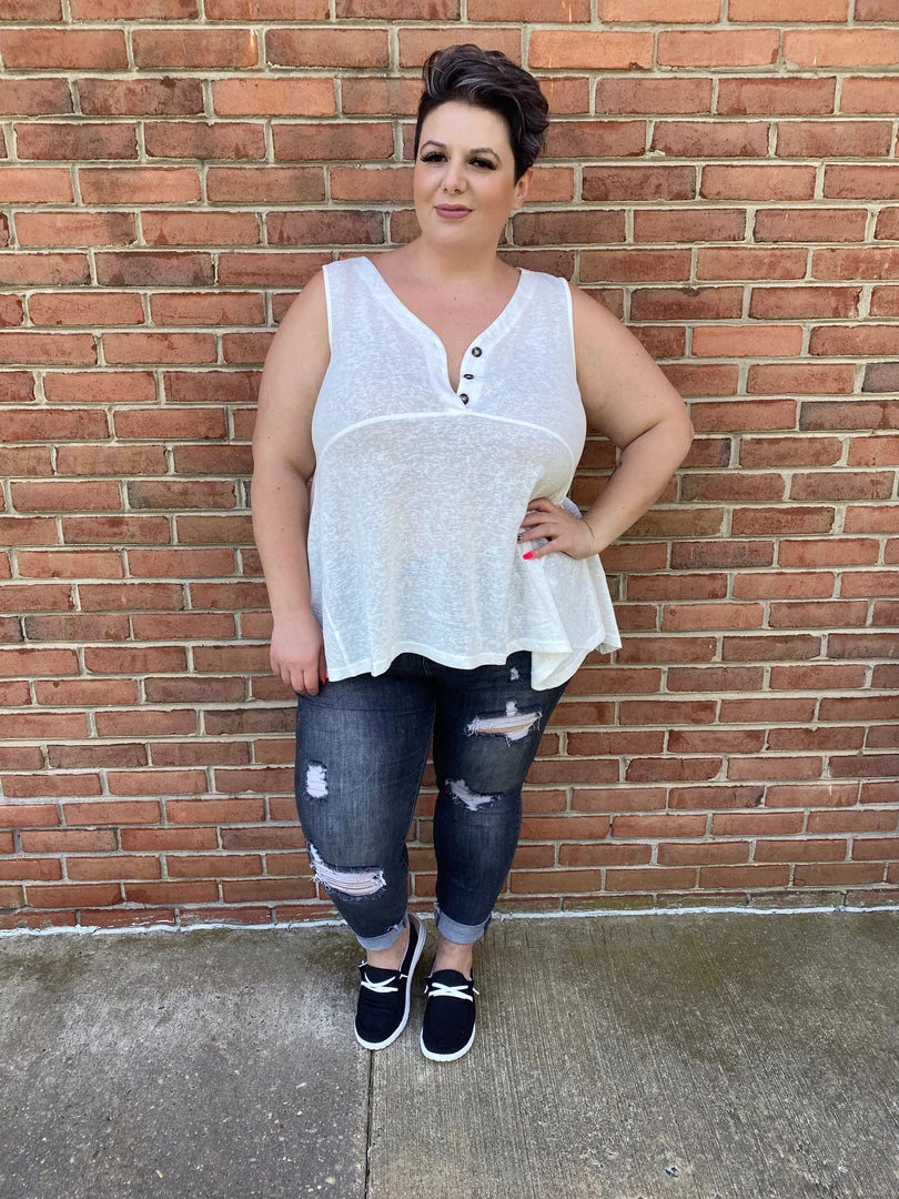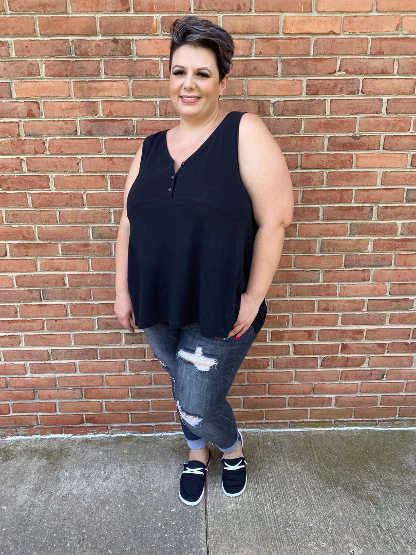 V-NECK, PLACKET FRONT WITH BUTTON, SLEEVELESS, TUNIC LENGTH,