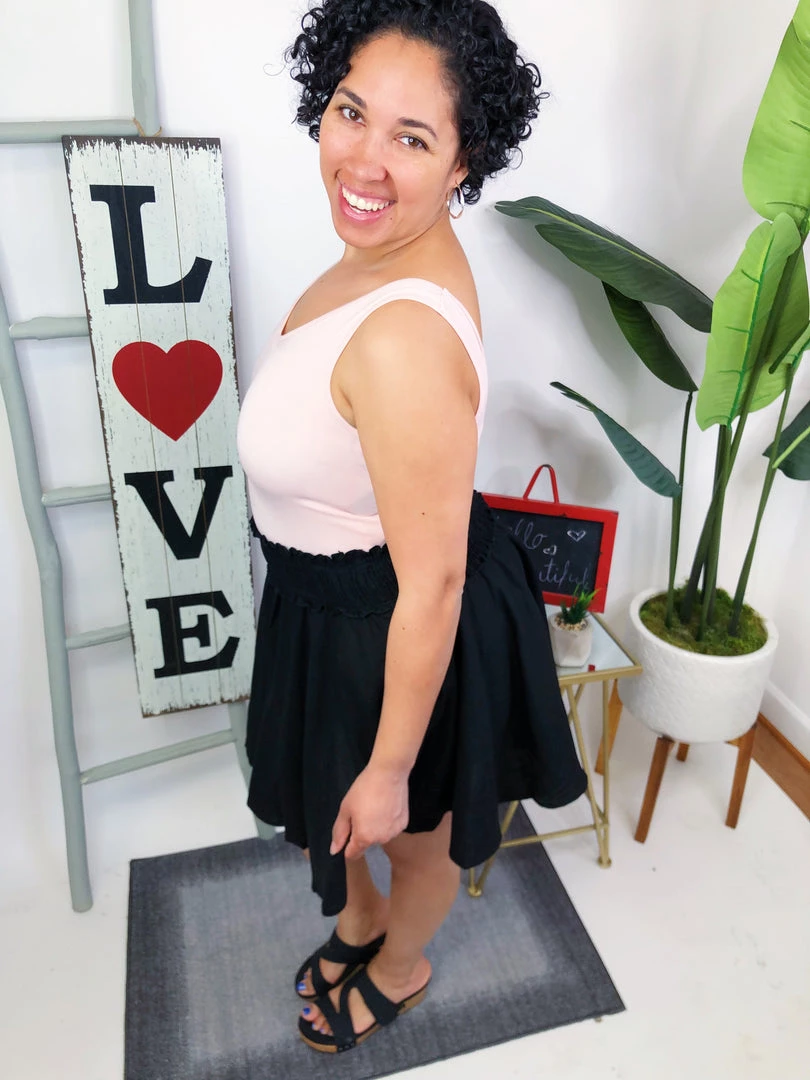 These skorts are GORGEOUS!Β A high-waisted solid woven skirt with a smocked elastic waist featuring a relaxed fit. Fabric is a lightweight woven linen material.