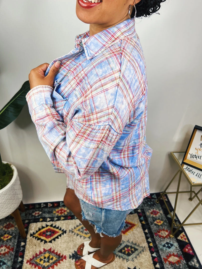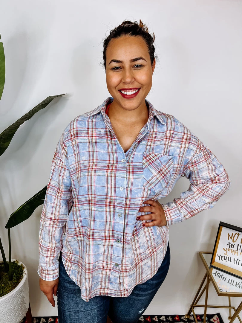 This is aΒ long sleeve plaid woven top with a button down front featuring a patch pocket and round hemline! The fabric is a lightweight woven material! This top is GORGEOUS!